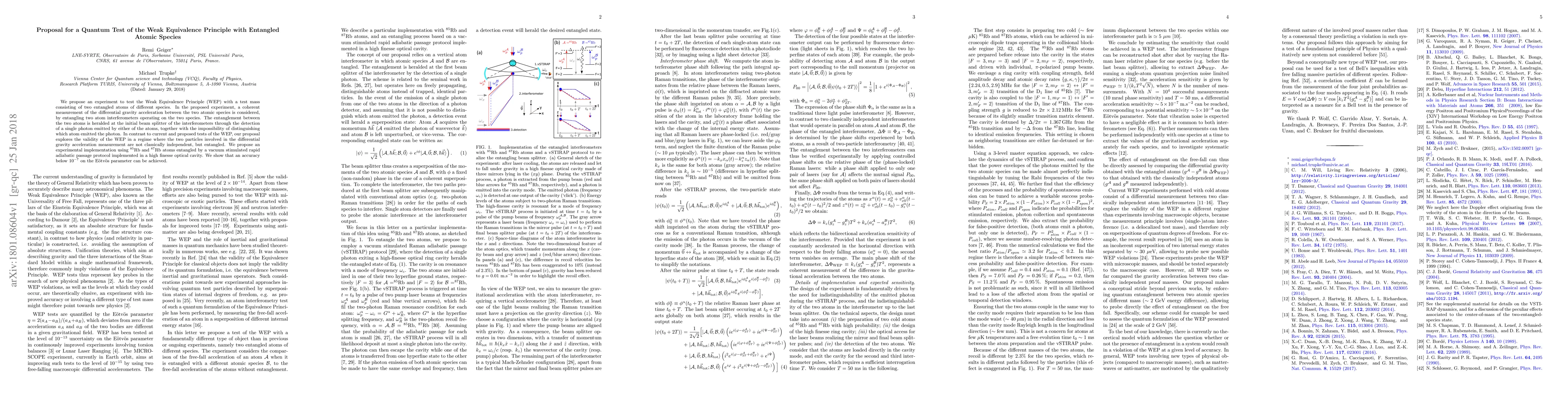 We propose an experiment to test the Weak Equivalence Principle (WEP) with a test mass consisting of two entangled atoms of different species. In the proposed experiment, a coherent measurement of the differential gravity acceleration between the two atomic species is considered, by entangling two atom interferometers operating on the two species. The entanglement between the two atoms is heralded at the initial beam splitter of the interferometers through the detection of a single photon emitted by either of the atoms, together with the impossibility of distinguishing which atom emitted the photon. In contrast to current and proposed tests of the WEP, our proposal explores the validity of the WEP in a regime where the two particles involved in the differential gravity acceleration measurement are not classically independent, but entangled. We propose an experimental implementation using $^{85}$Rb and $^{87}$Rb atoms entangled by a vacuum stimulated rapid adiabatic passage protocol implemented in a high finesse optical cavity. We show that an accuracy below $10^{-7}$ on the E\"otv\"os parameter can be achieved.