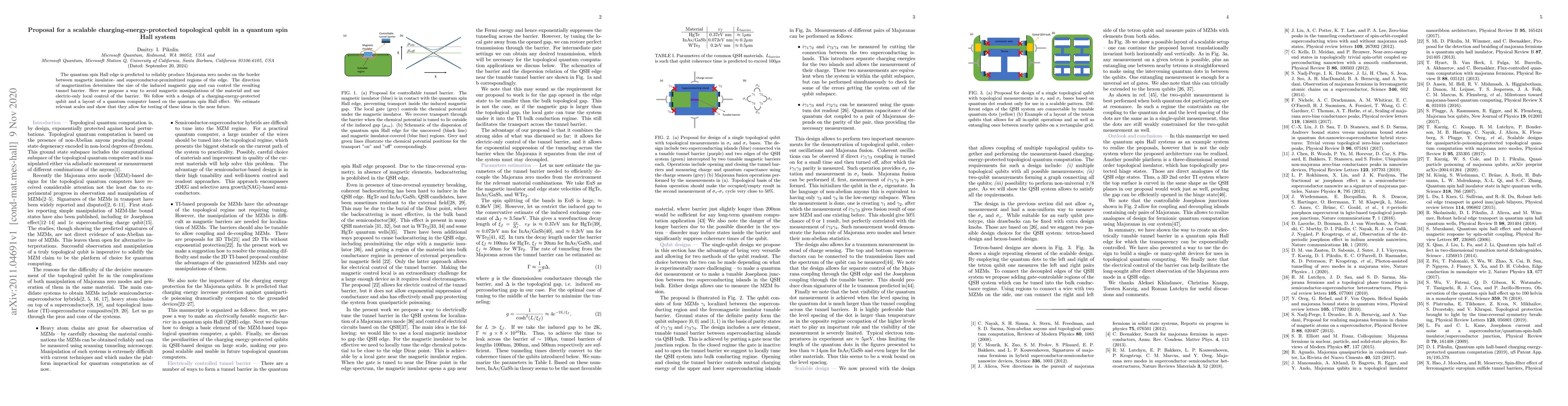 The quantum spin Hall edge is predicted to reliably produce Majorana zero modes on the border between magnetic insulator- and superconductor-proximitized regions of the edge. The direction of magnetization determines the size of the induced magnetic gap and can control the resulting tunnel barrier. Here we propose a way to avoid magnetic manipulations of the material and use electric-only local control of the barrier. We follow with a design of a charging-energy-protected qubit and a layout of a quantum computer based on the quantum spin Hall effect. We estimate relevant scales and show that they allow for testing of these ideas in the near future.