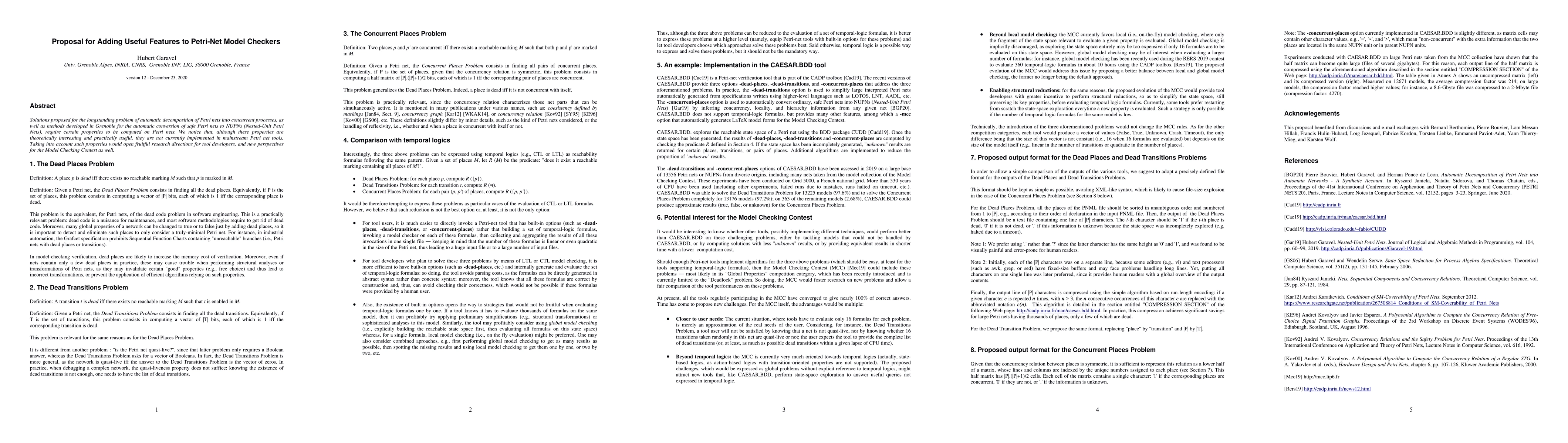 Solutions proposed for the longstanding problem of automatic decomposition of Petri nets into concurrent processes, as well as methods developed in Grenoble for the automatic conversion of safe Petri nets to NUPNs (Nested-Unit Petri Nets), require certain properties to be computed on Petri nets. We notice that, although these properties are theoretically interesting and practically useful, they are not currently implemented in mainstream Petri net tools. Taking into account such properties would open fruitful research directions for tool developers, and new perspectives for the Model Checking Contest as well.