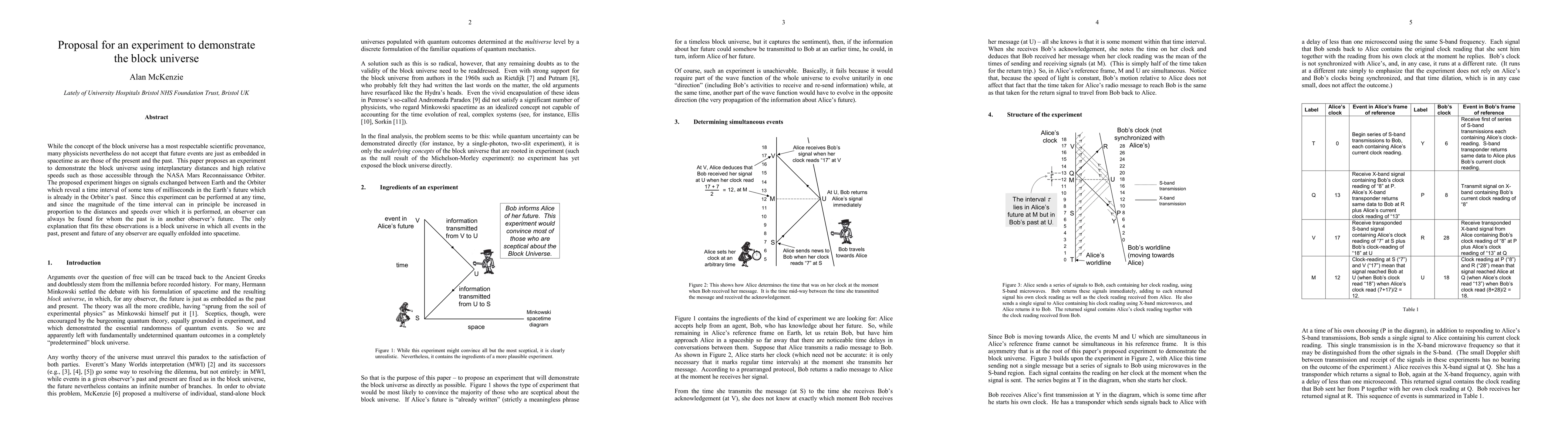 This paper proposes an experiment using signals from the Mars Reconnaissance Orbiter to demonstrate the block universe theory, showing that future events on Earth are already past events for the Orbiter, thereby supporting the idea that all time is equally embedded in spacetime. The experiment aims to reveal a time interval in the future of Earth that is already in the past of the Orbiter, reinforcing the concept of a block universe.