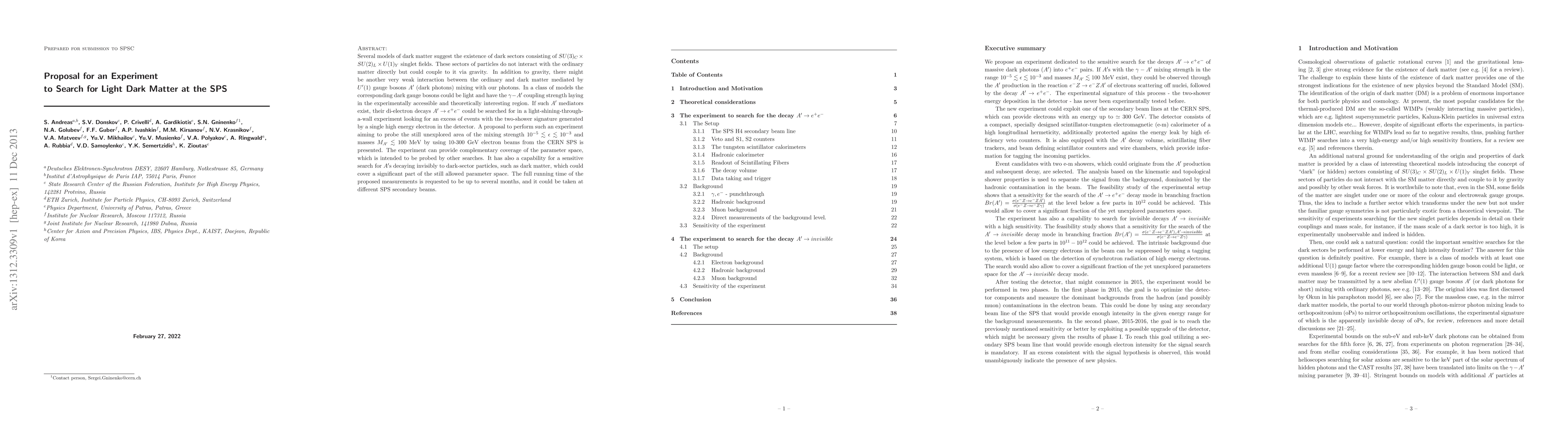 The paper proposes an experiment at CERN's SPS to detect light dark matter particles (A') via their di-electron decays, A' -> e+e-, using high-energy electron beams. The goal is to explore uncharted territory in the mixing strength (10^-5 < ε < 10^-3) and masses (M_A' < 100 MeV). This experiment aims to complement other searches and also investigate A's decaying into invisible dark-sector particles, which could be dark matter candidates.