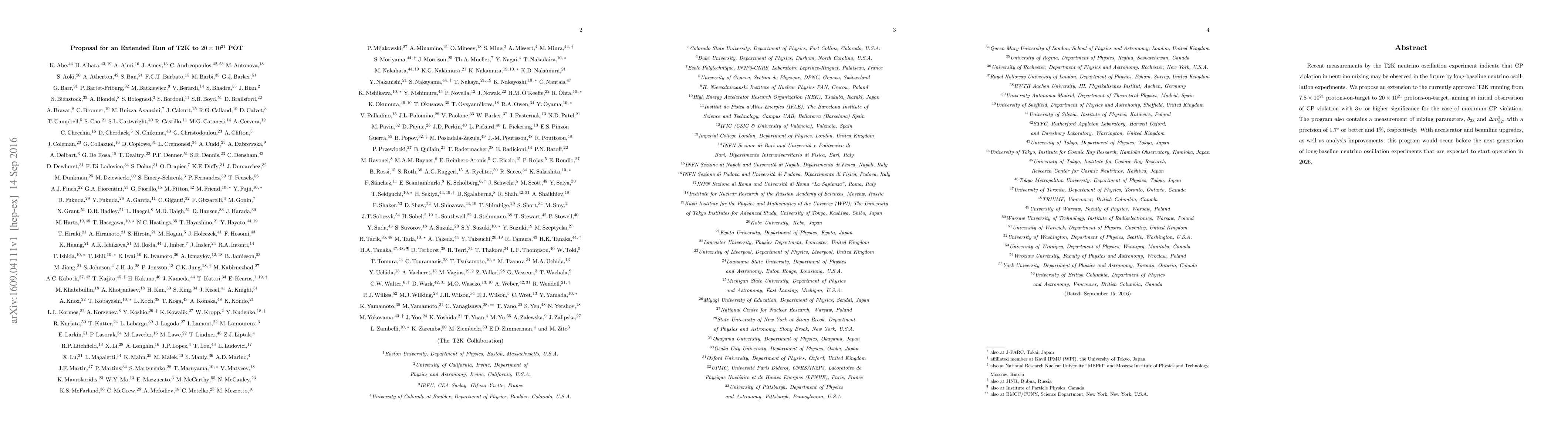 The T2K neutrino oscillation experiment proposes an extended run to $20 imes 10^{21}$ POT to observe CP violation with 3$ au$ or higher significance and measure mixing parameters $ heta_{23}$ and $ abla m^2_{32}$ with high precision.