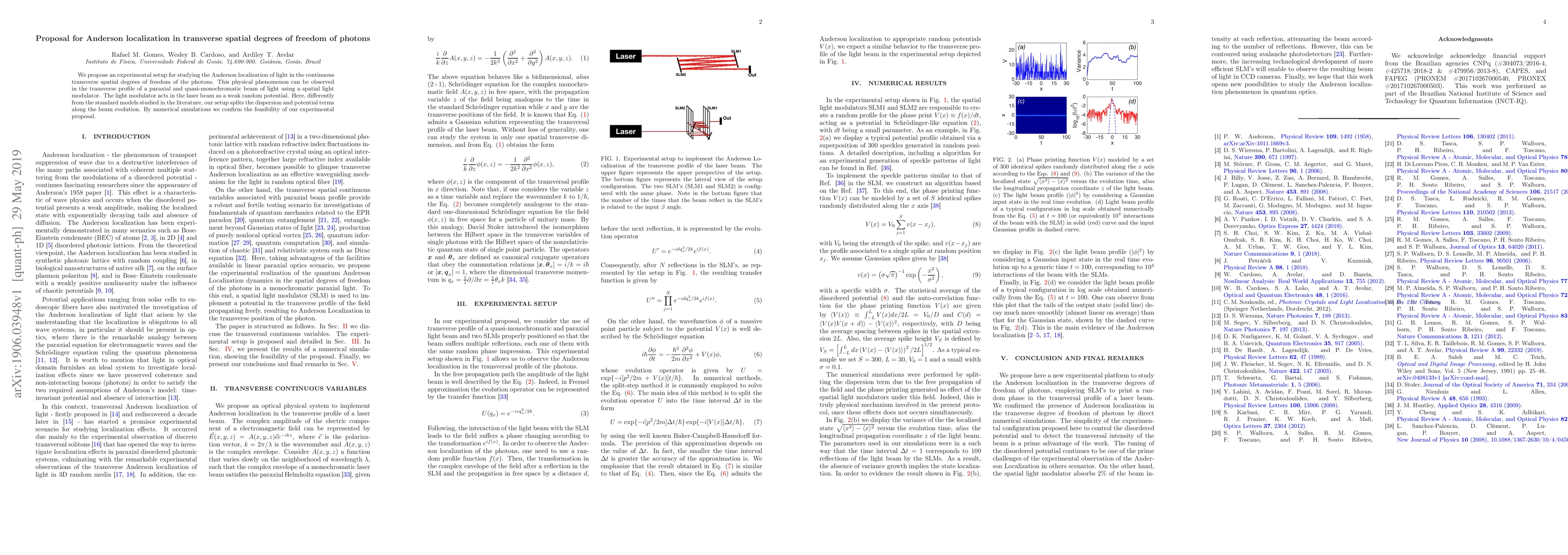This paper proposes an experimental setup to study Anderson localization of light in the transverse spatial degrees of photons using a spatial light modulator to create a weak random potential. The setup separates dispersion and potential terms differently from standard models, confirmed by numerical simulations.