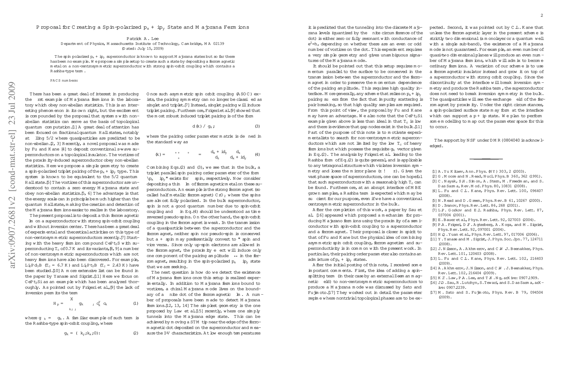 Summary: This research proposes a method to generate a spin-polarized p_x + ip_y superconducting state that supports Majorana fermions. The suggested setup involves a ferromagnetic metal layer on a non-centrosymmetric superconductor with strong spin-orbit coupling and a Rashba-type term.