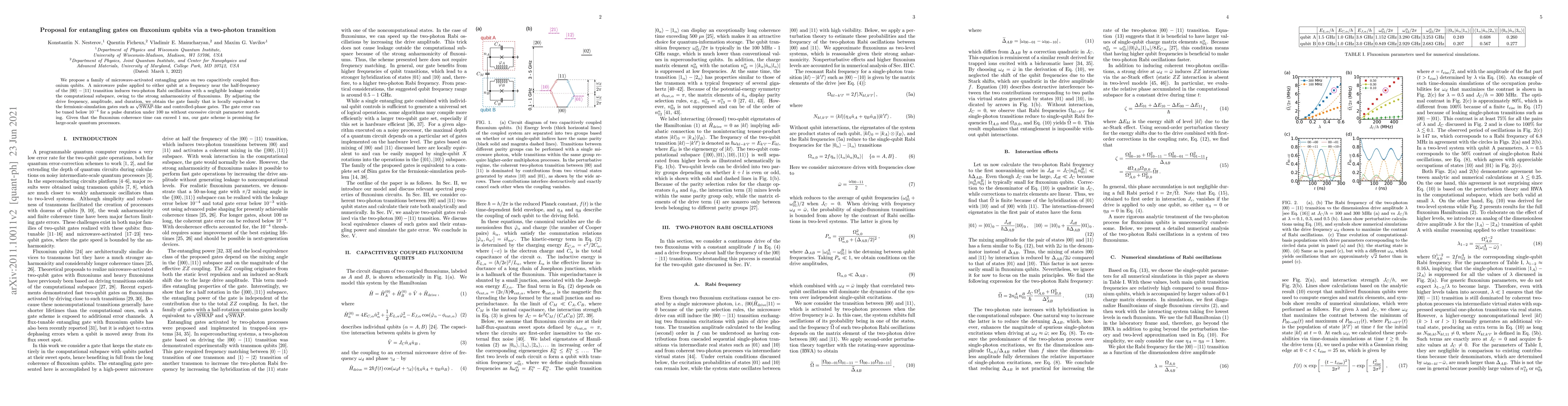 We propose a family of microwave-activated entangling gates on two capacitively coupled fluxonium qubits. A microwave pulse applied to either qubit at a frequency near the half-frequency of the $|00\rangle - |11\rangle$ transition induces two-photon Rabi oscillations with a negligible leakage outside the computational subspace, owing to the strong anharmonicity of fluxoniums. By adjusting the drive frequency, amplitude, and duration, we obtain the gate family that is locally equivalent to the fermionic-simulation gates such as $\sqrt{\rm SWAP}$-like and controlled-phase gates. The gate error can be tuned below $10^{-4}$ for a pulse duration under 100 ns without excessive circuit parameter matching. Given that the fluxonium coherence time can exceed 1 ms, our gate scheme is promising for large-scale quantum processors.