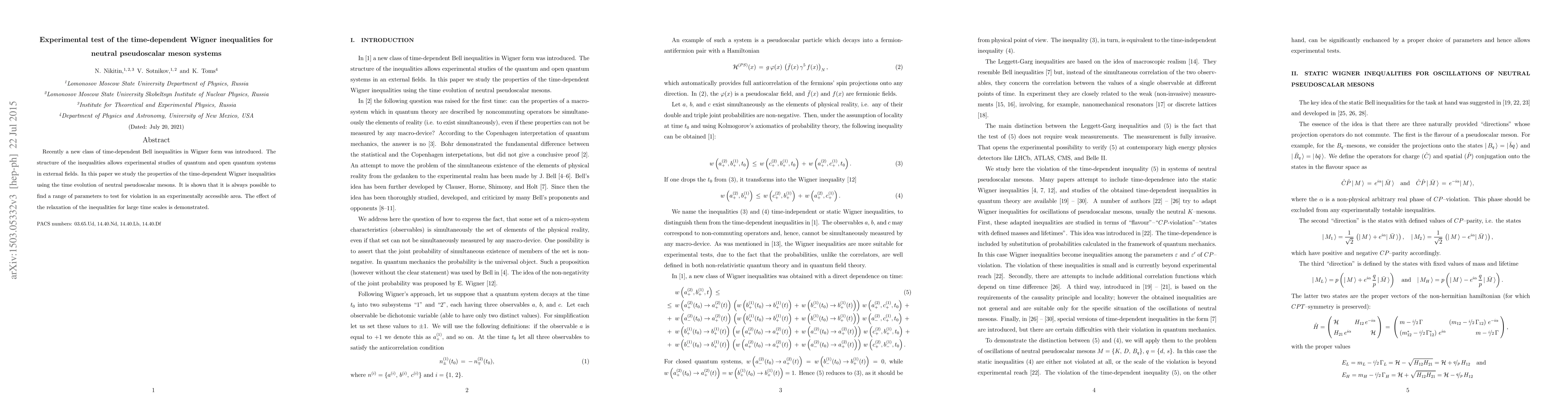 Recently a new class of time-dependent Bell inequalities in Wigner form was introduced. The structure of the inequalities allows experimental studies of quantum and open quantum systems in external fields. In this paper we study the properties of the time dependent Wigner inequalities using the time evolution of neutral pseudoscalar mesons. It is shown that it is always possible to find a range of parameters to test for violation in an experimentally accessible area. The effect of the relaxation of the inequalities for large time scales is demonstrated.