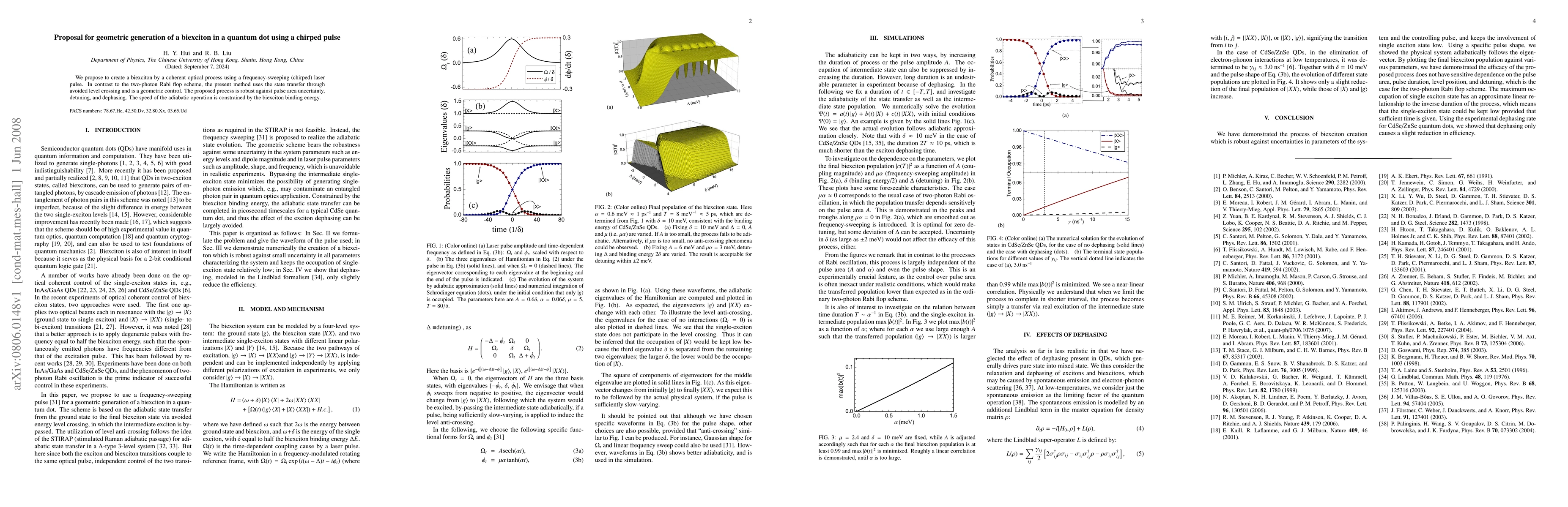 Summary: This paper proposes a method to generate a biexciton in a quantum dot using a chirped laser pulse, leveraging geometric control through avoided level crossing, which is robust against uncertainties and dephasing. The process's speed is limited by the biexciton binding energy.