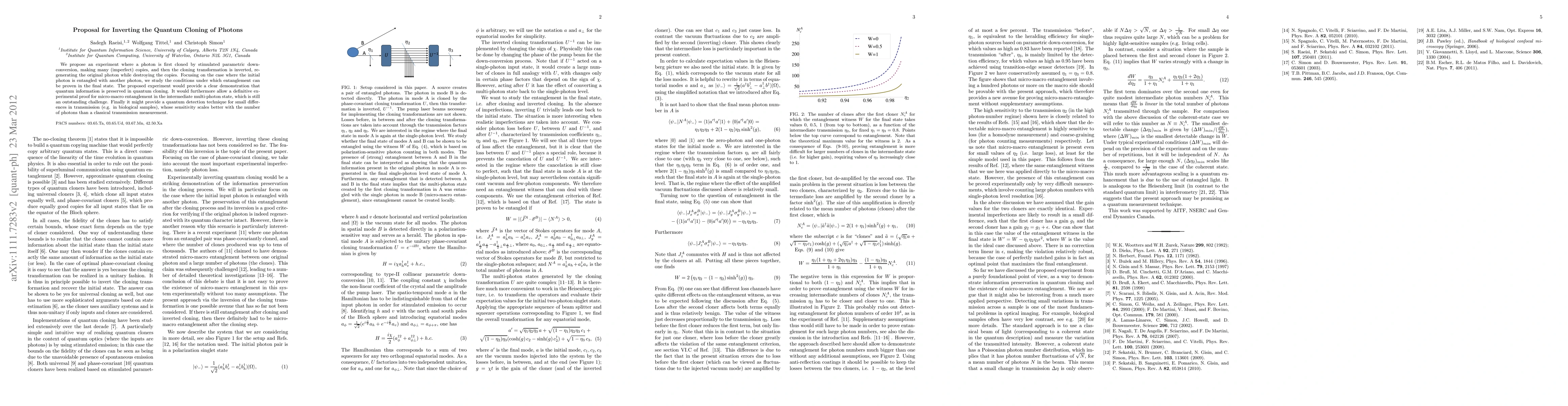We propose an experiment where a photon is first cloned by stimulated parametric down-conversion, making many (imperfect) copies, and then the cloning transformation is inverted, regenerating the original photon while destroying the copies. Focusing on the case where the initial photon is entangled with another photon, we study the conditions under which entanglement can be proven in the final state. The proposed experiment would provide a clear demonstration that quantum information is preserved in quantum cloning. It would furthermore allow a definitive experimental proof for micro-macro entanglement in the intermediate multiphoton state, which is still an outstanding challenge. Finally, it might provide a quantum detection technique for small differences in transmission (e.g., in biological samples), whose sensitivity scales better with the number of photons used than a classical transmission measurement.
