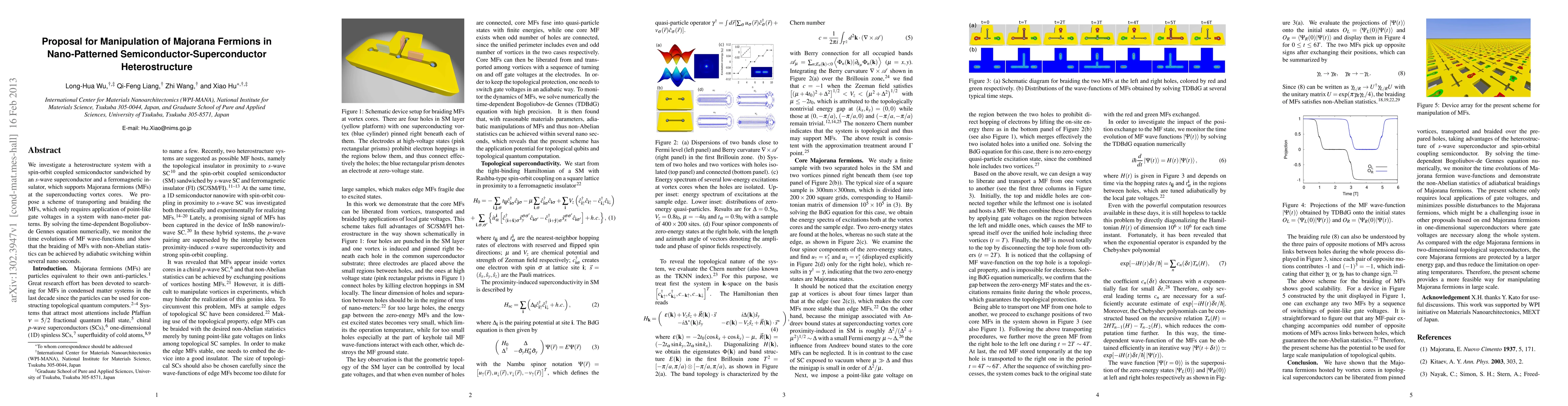This paper proposes a method to manipulate Majorana fermions in nano-patterned semiconductor-superconductor heterostructures using point-like gate voltages. The study demonstrates the feasibility of transporting and braiding Majorana fermions through numerical solutions of the time-dependent Bogoliubov-de Gennes equation, showing non-Abelian statistics can be achieved via adiabatic switching.