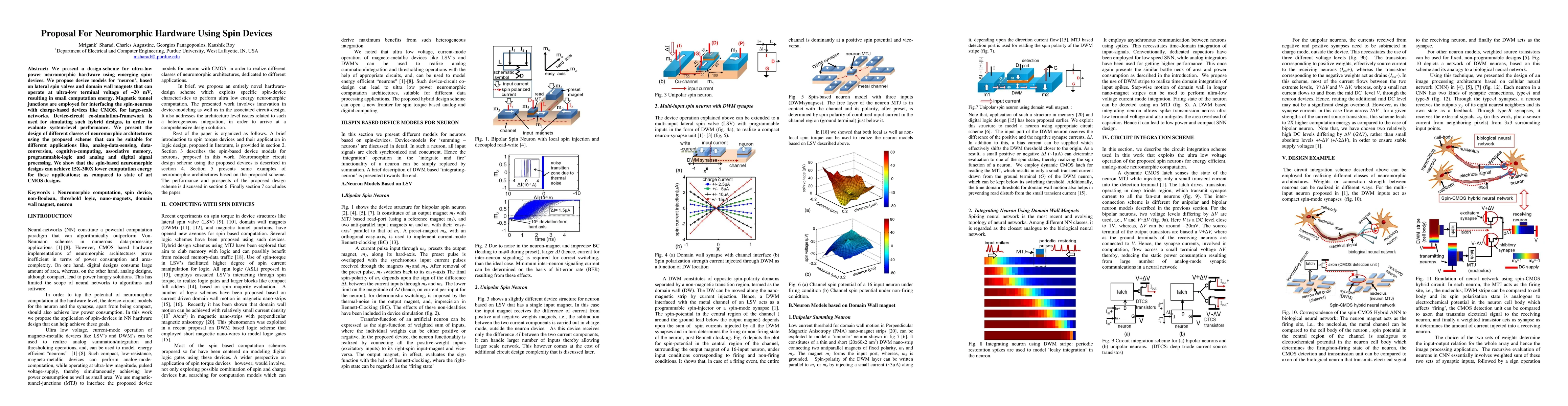 This paper proposes a design-scheme for ultra-low power neuromorphic hardware using spin-devices, including lateral spin valves and domain wall magnets, achieving operation at ~20 mV. The study shows significant energy savings, 15X-300X lower than CMOS designs, for various applications like cognitive computing and signal processing.