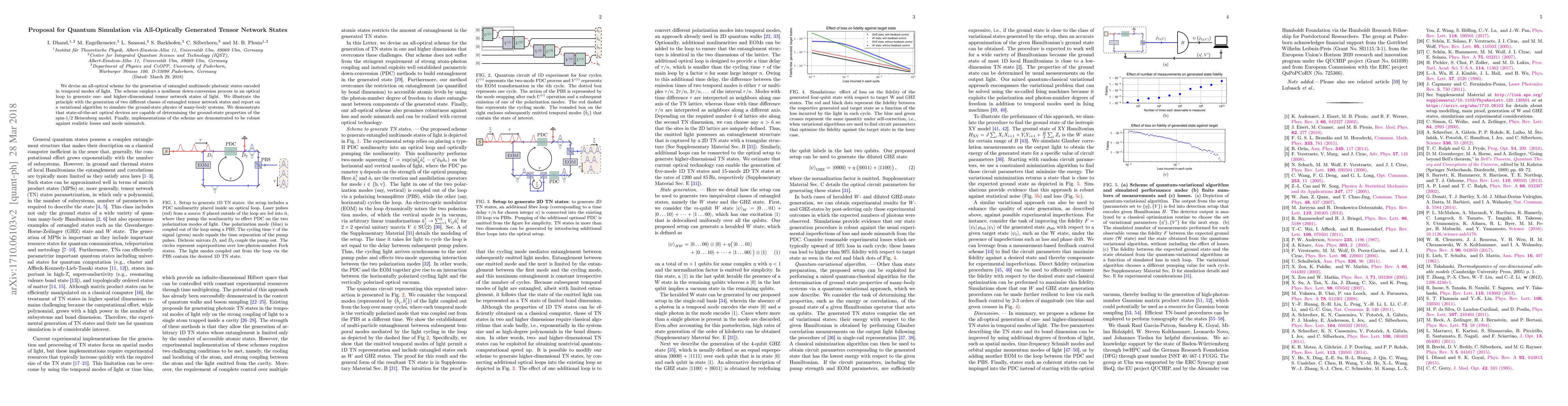 We devise an all-optical scheme for the generation of entangled multimode photonic states encoded in temporal modes of light. The scheme employs a nonlinear down-conversion process in an optical loop to generate one- and higher-dimensional tensor network states of light. We illustrate the principle with the generation of two different classes of entangled tensor network states and report on a variational algorithm to simulate the ground-state physics of many-body systems. We demonstrate that state-of-the-art optical devices are capable of determining the ground-state properties of the spin-1/2 Heisenberg model. Finally, implementations of the scheme are demonstrated to be robust against realistic losses and mode mismatch.