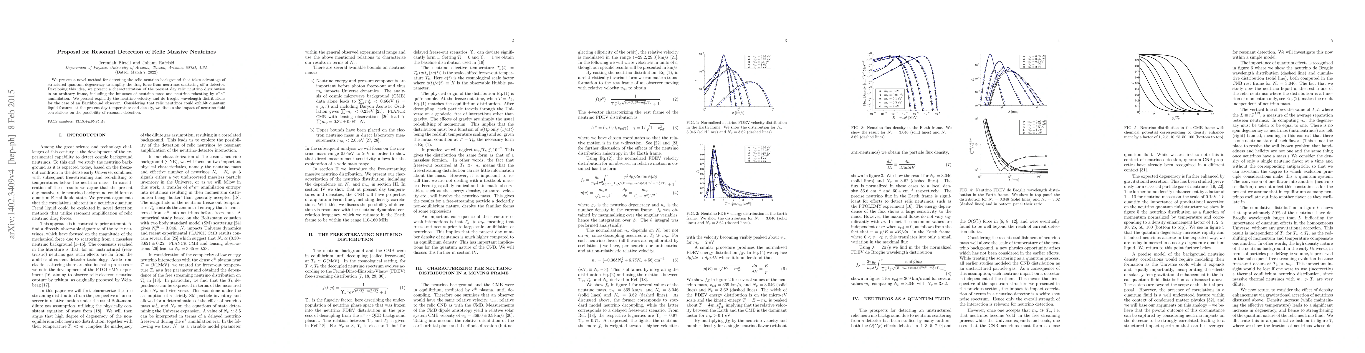 This paper proposes a novel resonant method to detect relic neutrinos by leveraging quantum degeneracy to enhance drag forces from neutrino scattering. It characterizes the relic neutrino distribution, considering neutrino mass and $e^+e^-$ annihilation, and discusses how neutrino fluid correlations might influence resonant detection.