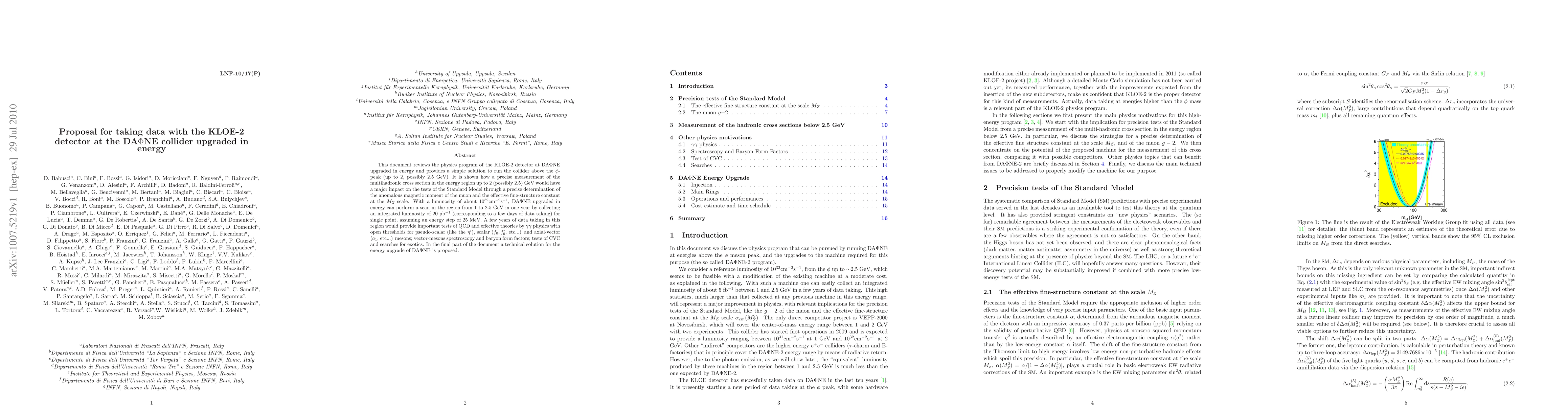This document reviews the physics program of the KLOE-2 detector at DA$\Phi$NE upgraded in energy and provides a simple solution to run the collider above the $\phi$-peak (up to 2, possibly 2.5 GeV). It is shown how a precise measurement of the multihadronic cross section in the energy region up to 2 (possibly 2.5) GeV would have a major impact on the tests of the Standard Model through a precise determination of the anomalous magnetic moment of the muon and the effective fine-structure constant at the $M_Z$ scale. With a luminosity of about $10^{32}$cm$^{-2}$s$^{-1}$, DA$\Phi$NE upgraded in energy can perform a scan in the region from 1 to 2.5 GeV in one year by collecting an integrated luminosity of 20 pb$^{-1}$ (corresponding to a few days of data taking) for single point, assuming an energy step of 25 MeV. A few years of data taking in this region would provide important tests of QCD and effective theories by $\gamma\gamma$ physics with open thresholds for pseudo-scalar (like the $\eta'$), scalar ($f_0,f'_0$, etc...) and axial-vector ($a_1$, etc...) mesons; vector-mesons spectroscopy and baryon form factors; tests of CVC and searches for exotics. In the final part of the document a technical solution for the energy upgrade of DA$\Phi$NE is proposed.