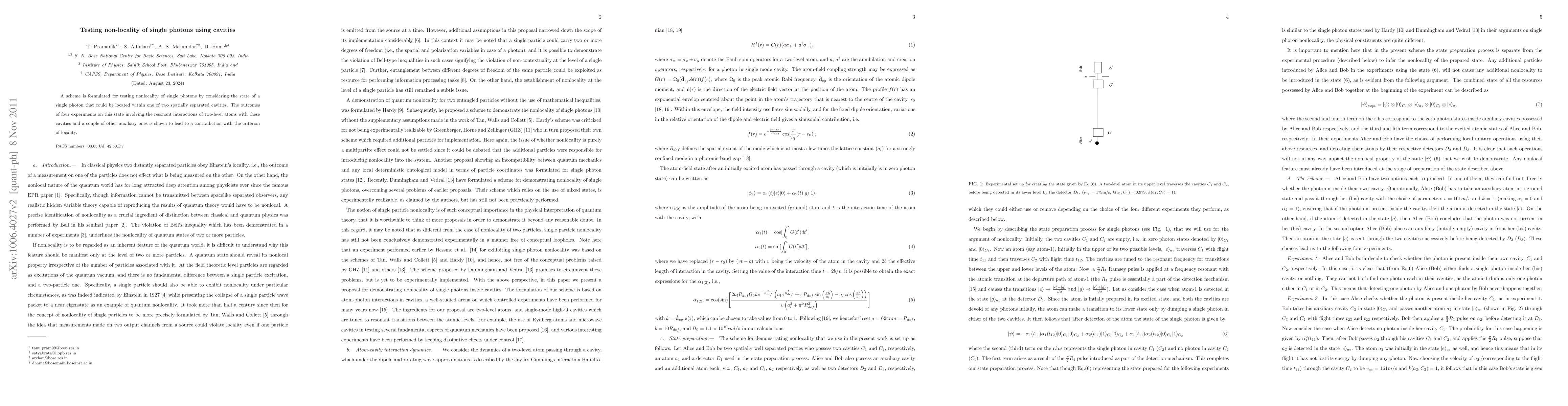 A scheme is formulated for testing nonlocality of single photons by considering the state of a single photon that could be located within one of two spatially separated cavities. The outcomes of four experiments on this state involving the resonant interactions of two-level atoms with these cavities and a couple of other auxiliary ones is shown to lead to a contradiction with the criterion of locality.