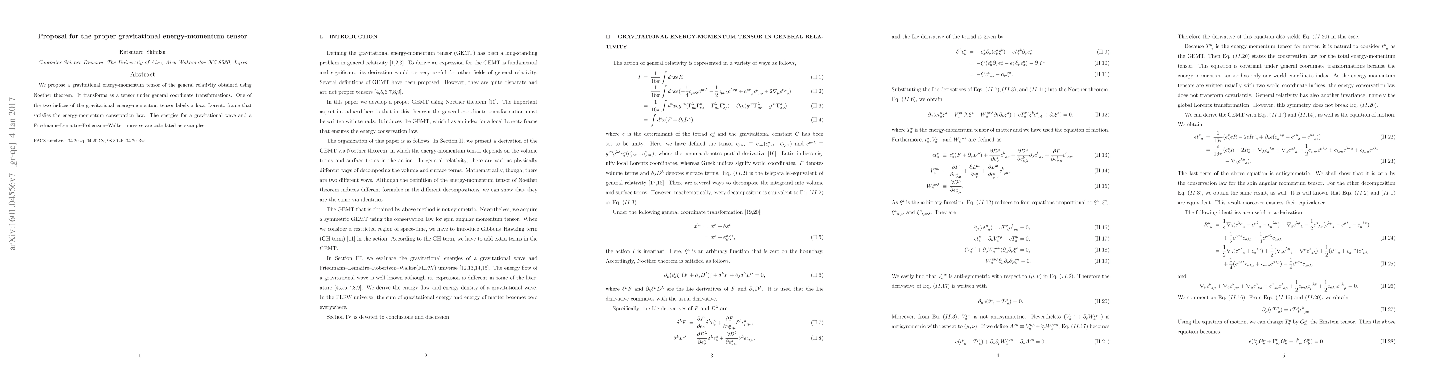 This paper proposes a gravitational energy-momentum tensor derived from Noether's theorem for general relativity, which transforms as a tensor under coordinate transformations. The tensor includes a local Lorentz frame and satisfies energy-momentum conservation, with calculations for gravitational waves and FLRW universes as examples.