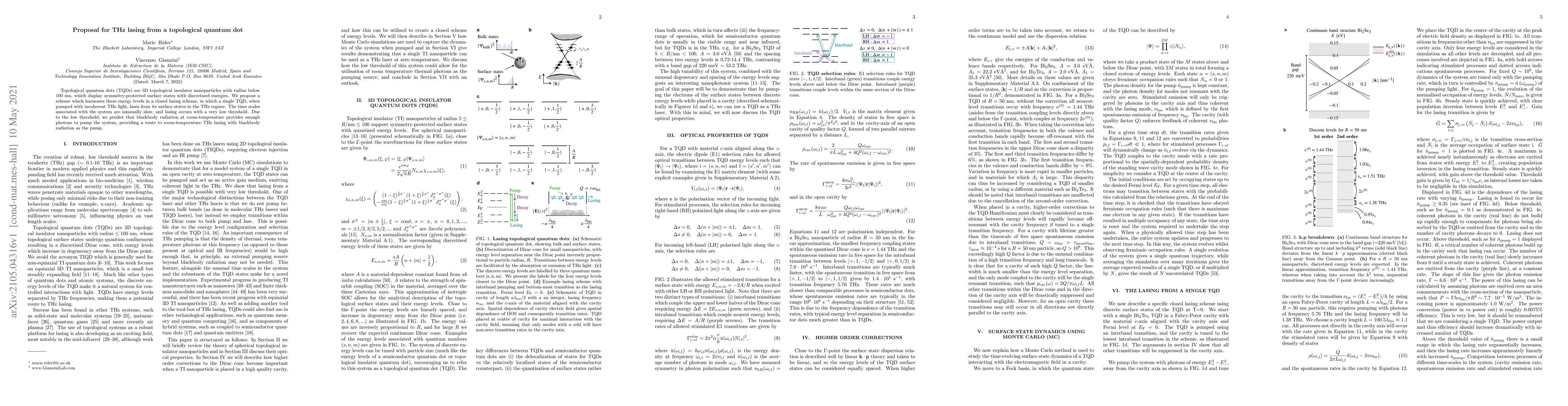This paper proposes a novel scheme for THz lasing using topological quantum dots, which exploit their unique surface states to achieve lasing with a very low threshold. The authors suggest that room-temperature blackbody radiation can sufficiently pump the system, enabling room-temperature THz lasing.