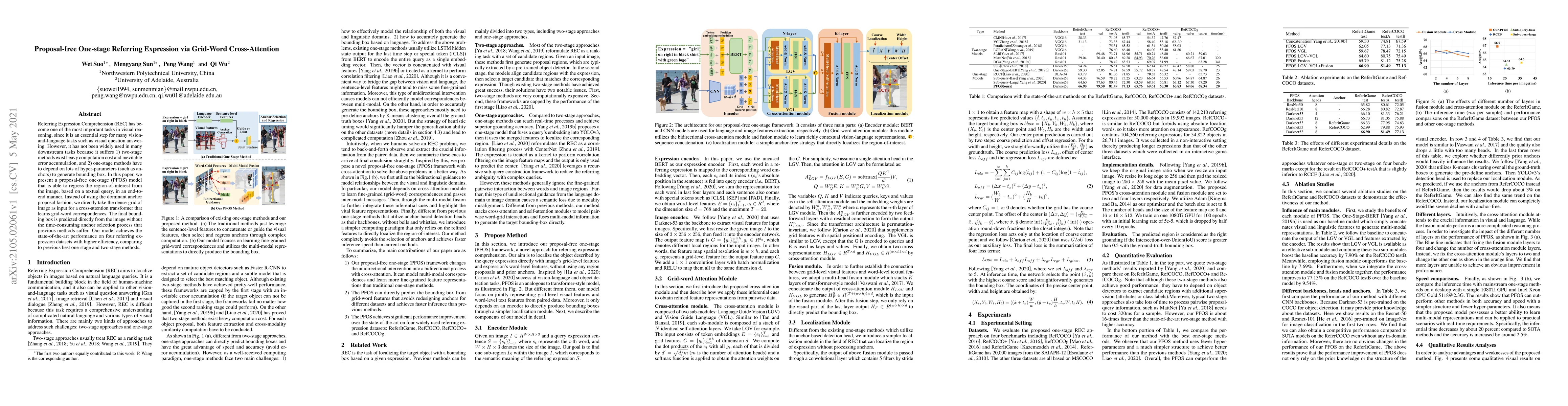 This paper introduces a proposal-free one-stage model for Referring Expression Comprehension (REC) that uses a grid-word cross-attention mechanism, achieving state-of-the-art performance with higher efficiency compared to traditional two-stage and one-stage methods. The model directly regresses the region-of-interest from an image without the need for anchor proposals.