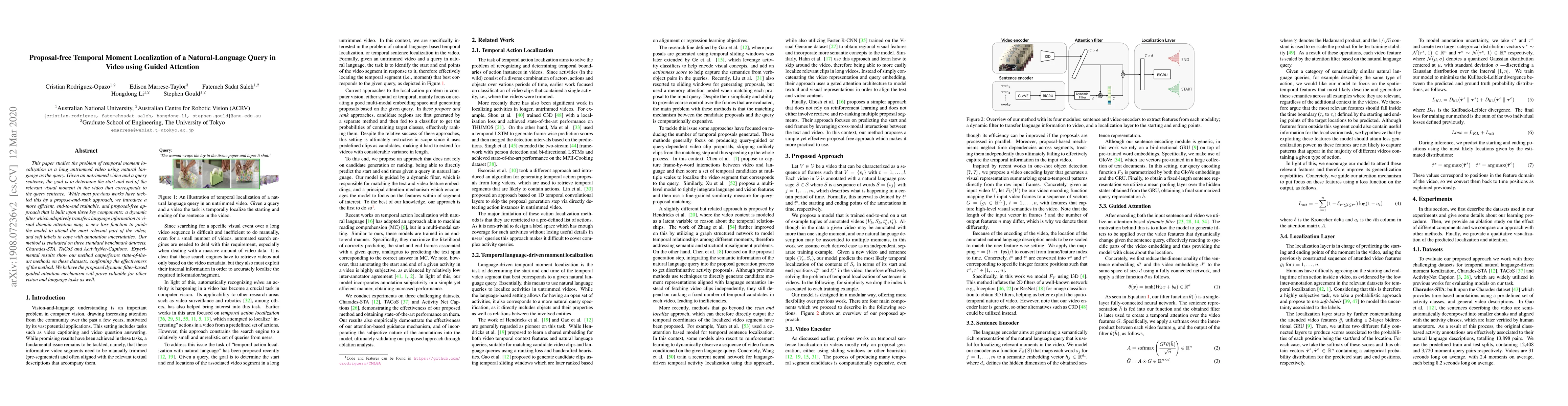 This paper proposes a proposal-free method for localizing relevant moments in untrimmed videos based on natural language queries, utilizing guided attention, dynamic filtering, and a new loss function. The method outperforms existing propose-and-rank approaches on Charades-STA and ActivityNet-Captions datasets.