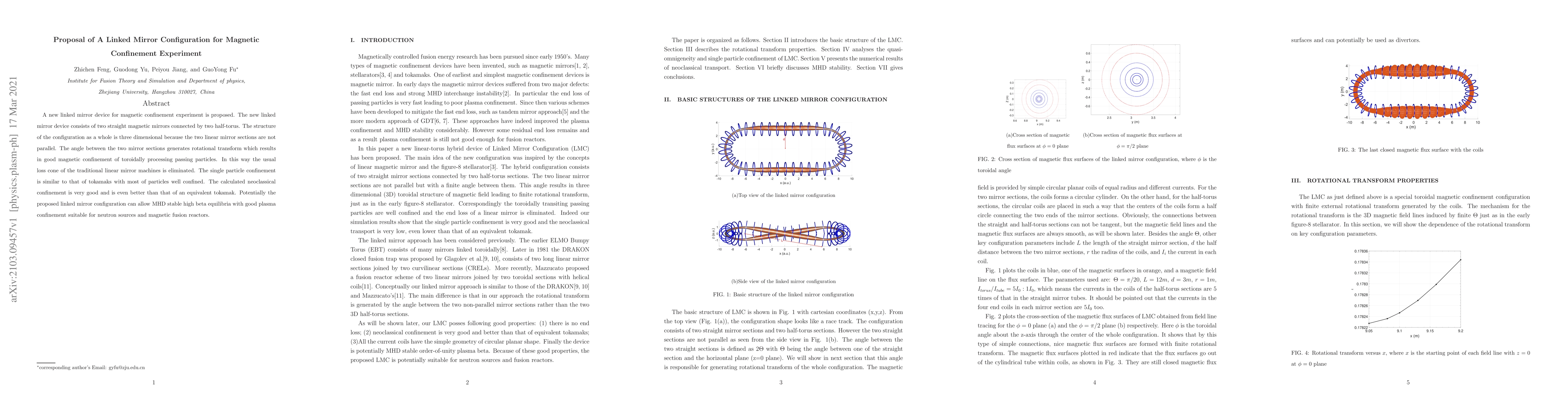 A new linked mirror device for magnetic confinement experiment is proposed. The new linked mirror device consists of two straight magnetic mirrors connected by two half-torus. The structure of the configuration as a whole is three dimensional because the two linear mirror sections are not parallel. The angle between the two mirror sections generates rotational transform which results in good magnetic confinement of toroidally processing passing particles. In this way the usual loss cone of the traditional linear mirror machines is eliminated. The single particle confinement is similar to that of tokamaks with most of particles well confined. The calculated neoclassical confinement is very good and is even better than that of an equivalent tokamak. Potentially the proposed linked mirror configuration can allow MHD stable high beta equilibria with good plasma confinement suitable for neutron sources and magnetic fusion reactors.