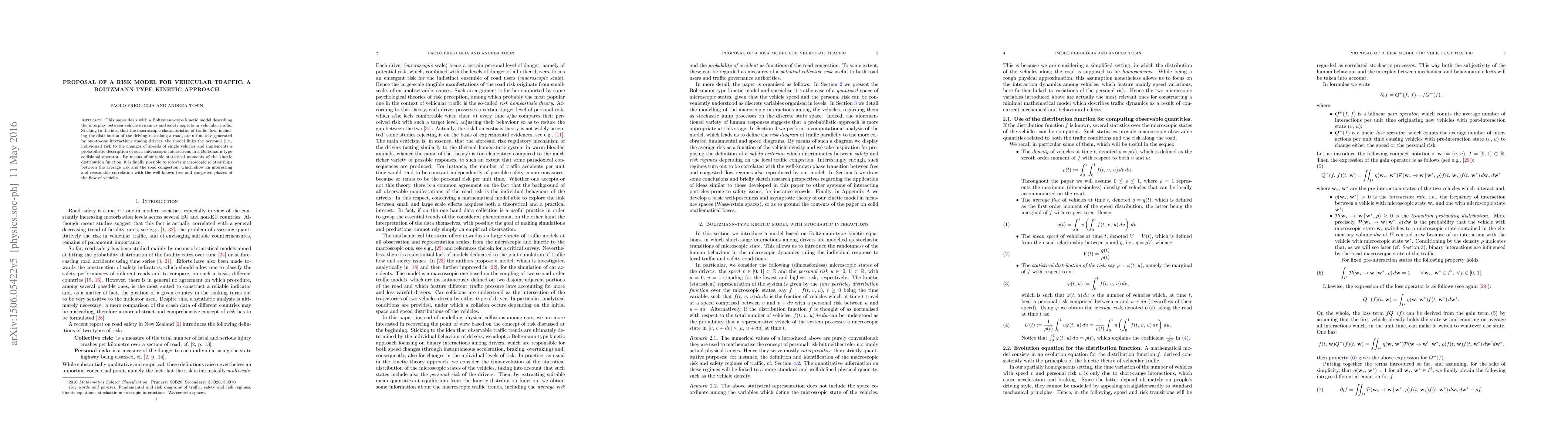 This paper deals with a Boltzmann-type kinetic model describing the interplay between vehicle dynamics and safety aspects in vehicular traffic. Sticking to the idea that the macroscopic characteristics of traffic flow, including the distribution of the driving risk along a road, are ultimately generated by one-to-one interactions among drivers, the model links the personal (i.e., individual) risk to the changes of speeds of single vehicles and implements a probabilistic description of such microscopic interactions in a Boltzmann-type collisional operator. By means of suitable statistical moments of the kinetic distribution function, it is finally possible to recover macroscopic relationships between the average risk and the road congestion, which show an interesting and reasonable correlation with the well-known free and congested phases of the flow of vehicles.