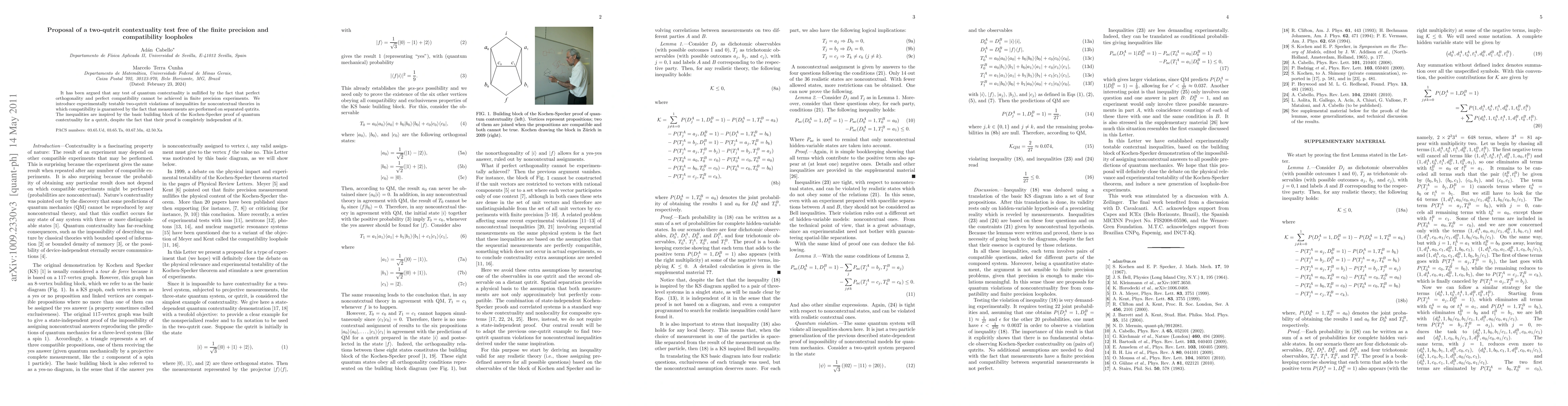 This paper proposes a two-qutrit contextuality test that eliminates finite precision and compatibility loopholes by performing measurements on separated qutrits, ensuring noncontextuality violations through independent inequalities inspired by the Kochen-Specker proof.