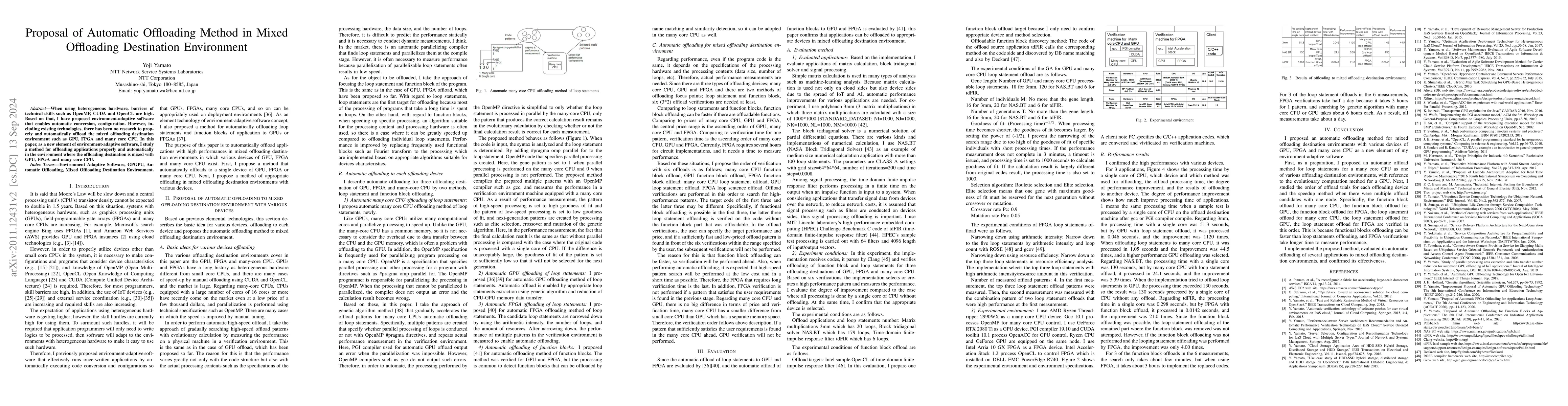 When using heterogeneous hardware, barriers of technical skills such as OpenMP, CUDA and OpenCL are high. Based on that, I have proposed environment-adaptive software that enables automatic conversion, configuration. However, including existing technologies, there has been no research to properly and automatically offload the mixed offloading destination environment such as GPU, FPGA and many core CPU. In this paper, as a new element of environment-adaptive software, I study a method for offloading applications properly and automatically in the environment where the offloading destination is mixed with GPU, FPGA and many core CPU.