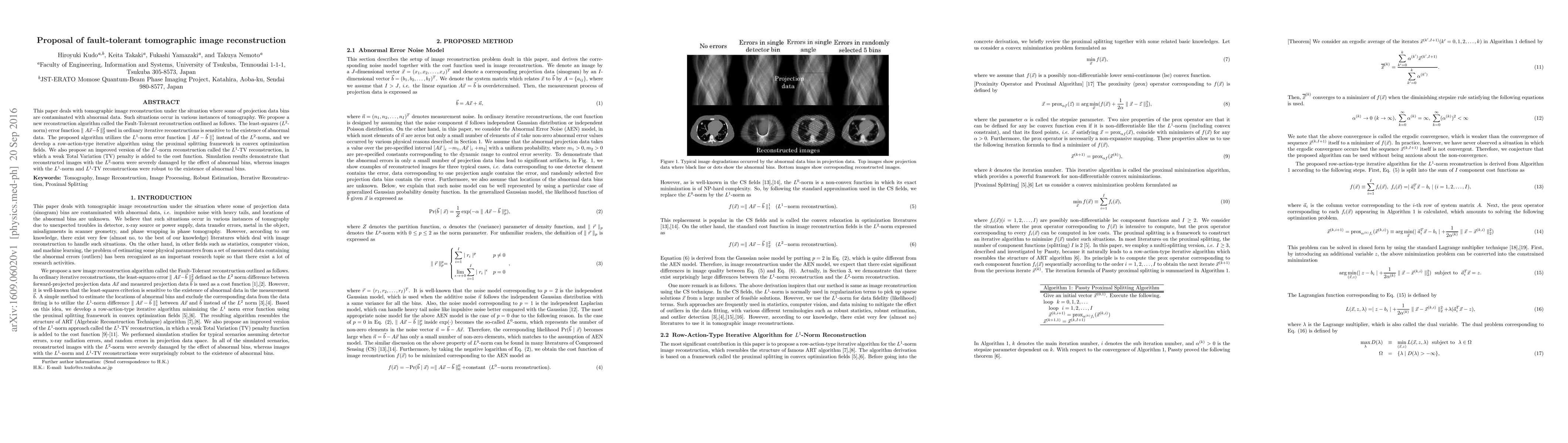 A new reconstruction algorithm proposes using L1-norm error function to improve fault-tolerant tomographic image reconstruction, reducing damage caused by abnormal data in projection bins.
