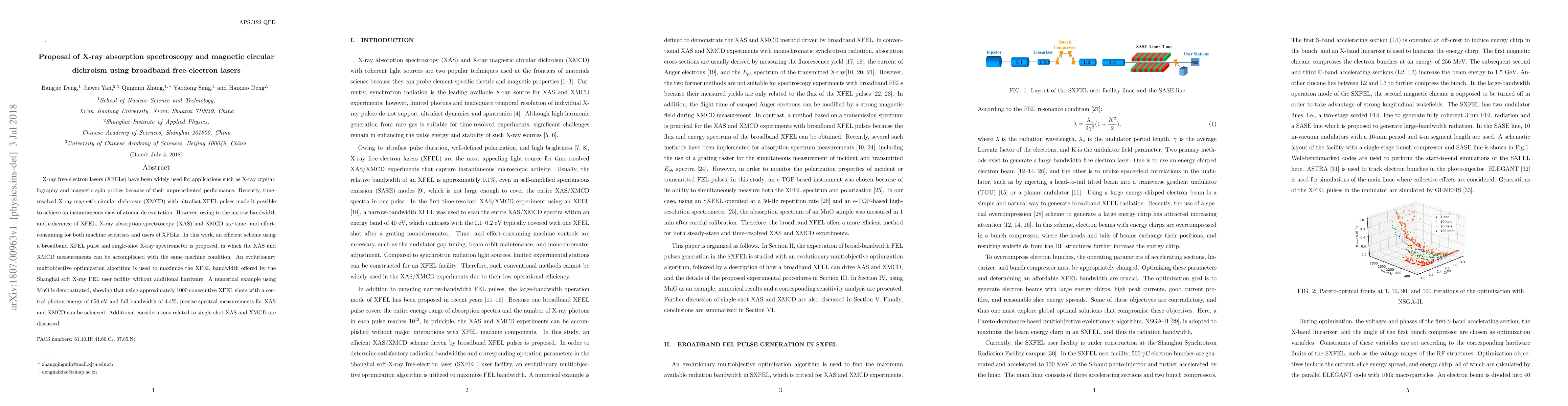 This paper proposes an efficient method for conducting X-ray absorption spectroscopy (XAS) and magnetic circular dichroism (XMCD) using broadband free-electron lasers (XFEL) to enhance measurement efficiency. The method employs an evolutionary multiobjective optimization algorithm to maximize the XFEL bandwidth, demonstrated with MnO, achieving precise spectral measurements with minimal effort.
