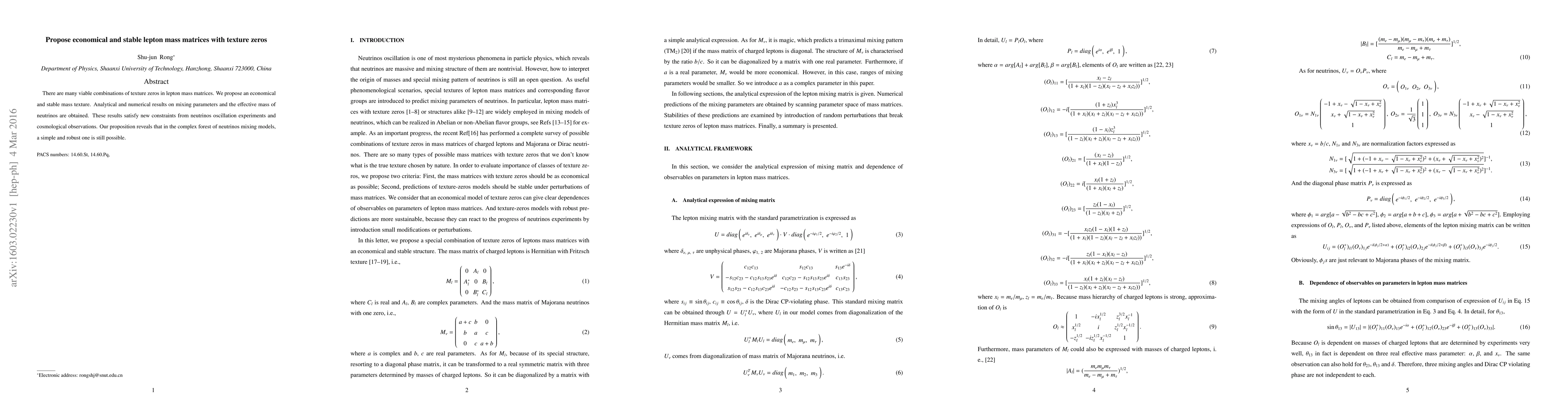 This paper proposes economical and stable lepton mass matrices characterized by texture zeros, achieving consistency with recent neutrino oscillation experiments and cosmological observations. The proposed model demonstrates that a simple and robust neutrino mixing framework can still be viable amidst complex models.