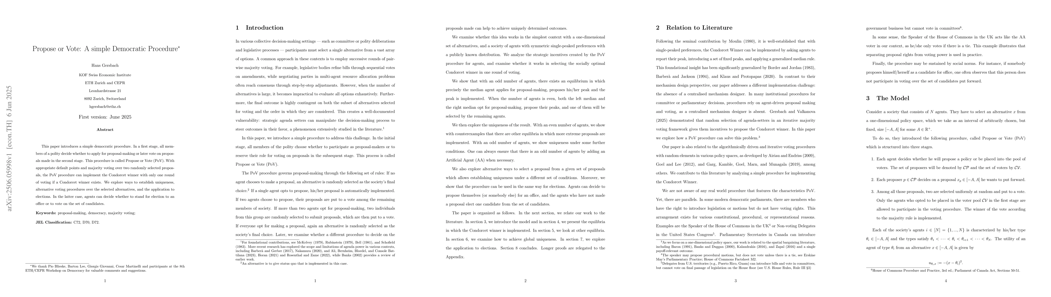 This paper introduces a simple democratic procedure. In a first stage, all members of a polity decide whether to apply for proposal-making or later vote on proposals made in the second stage. This procedure is called Propose or Vote (PoV). With appropriate default points and majority voting over two randomly selected proposals, the PoV procedure can implement the Condorcet winner with only one round of voting if a Condorcet winner exists. We explore ways to establish uniqueness, alternative voting procedures over the selected alternatives, and the application to elections. In the latter case, agents can decide whether to stand for election to an office or to vote on the set of candidates.