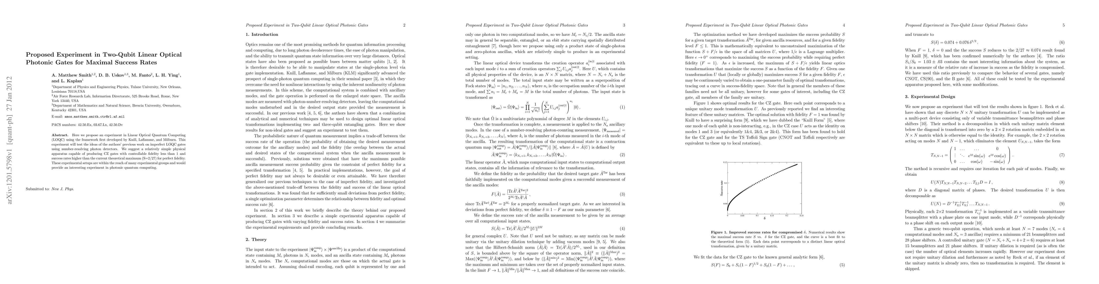 The proposed experiment uses the framework first developed by Knill, Laflamme, and Milburn to test ideas on imperfect LOQC gates using number-resolving photon detectors.