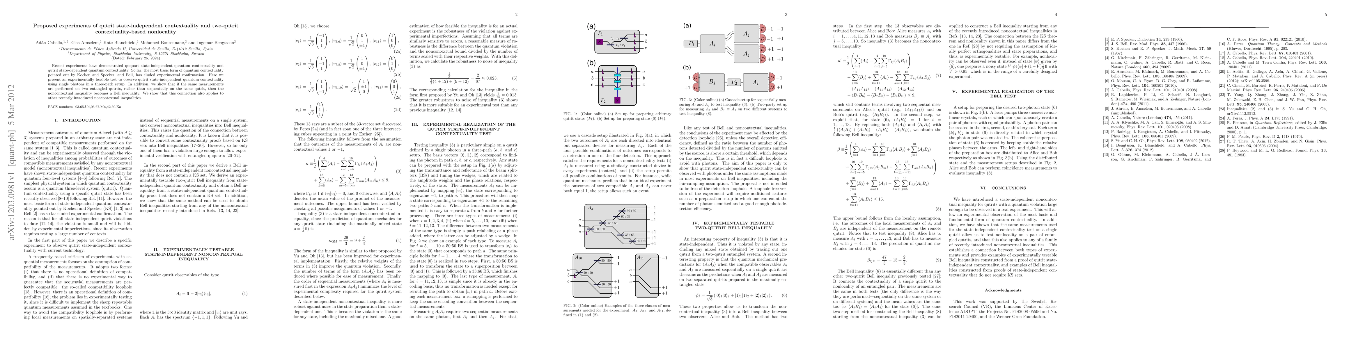 This paper proposes experiments to observe qutrit state-independent quantum contextuality using single photons in a three-path setup and demonstrates that measuring two entangled qutrits can transform noncontextual inequalities into Bell inequalities, highlighting a novel form of quantum nonlocality.