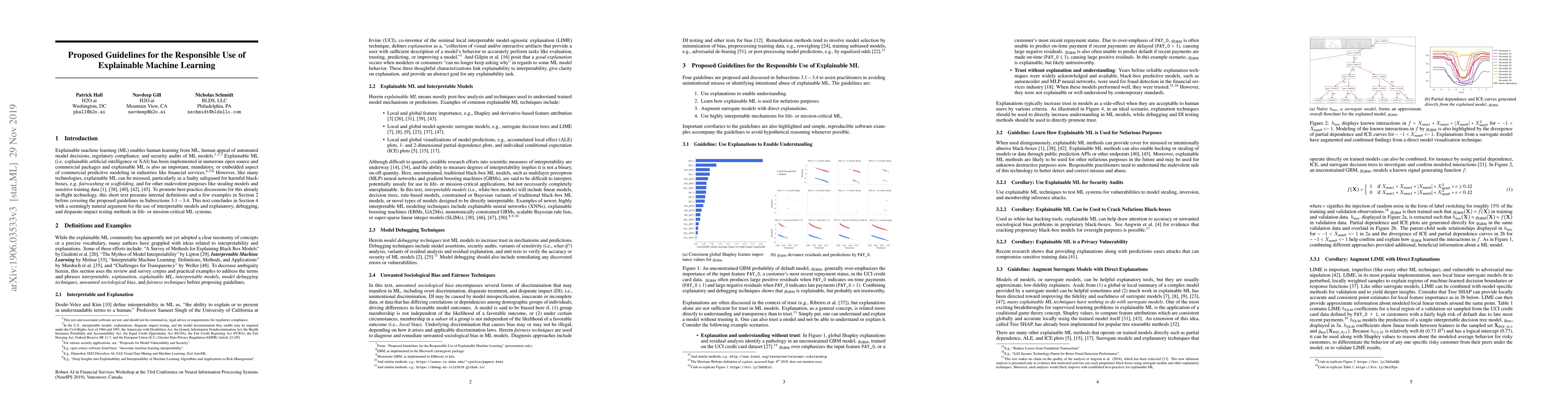 Explainable machine learning (ML) enables human learning from ML, human appeal of automated model decisions, regulatory compliance, and security audits of ML models. Explainable ML (i.e. explainable artificial intelligence or XAI) has been implemented in numerous open source and commercial packages and explainable ML is also an important, mandatory, or embedded aspect of commercial predictive modeling in industries like financial services. However, like many technologies, explainable ML can be misused, particularly as a faulty safeguard for harmful black-boxes, e.g. fairwashing or scaffolding, and for other malevolent purposes like stealing models and sensitive training data. To promote best-practice discussions for this already in-flight technology, this short text presents internal definitions and a few examples before covering the proposed guidelines. This text concludes with a seemingly natural argument for the use of interpretable models and explanatory, debugging, and disparate impact testing methods in life- or mission-critical ML systems.
