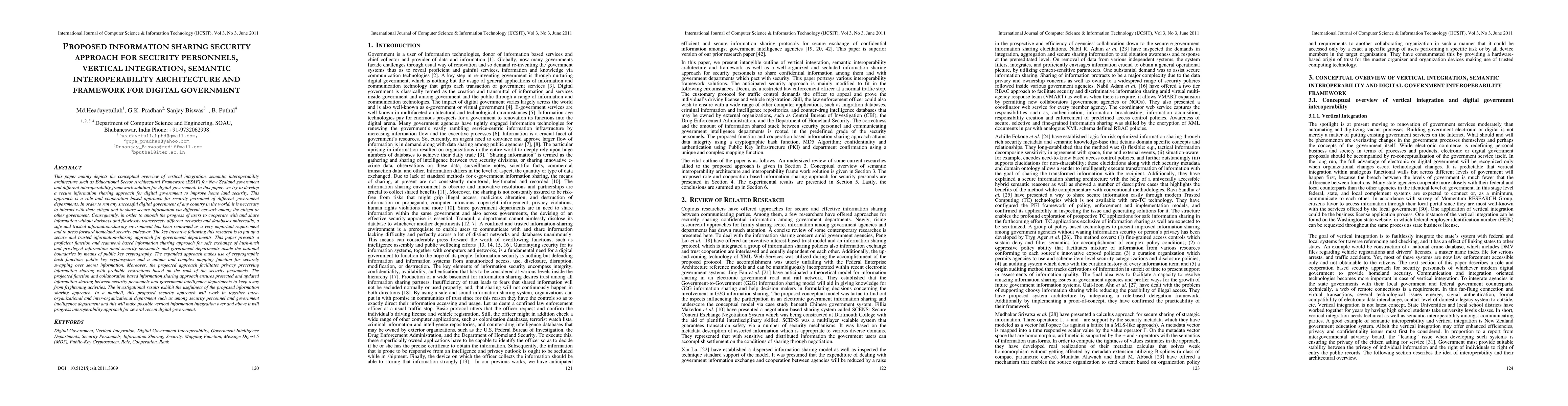 This paper mainly depicts the conceptual overview of vertical integration, semantic interoperability architecture such as Educational Sector Architectural Framework (ESAF) for New Zealand government and different interoperability framework solution for digital government. In this paper, we try to develop a secure information sharing approach for digital government to improve home land security. This approach is a role and cooperation based approach for security personnel of different government departments. In order to run any successful digital government of any country in the world, it is necessary to interact with their citizen and to share secure information via different network among the citizen or other government. Consequently, in order to smooth the progress of users to cooperate with and share information without darkness and flawlessly transversely different networks and databases universally, a safe and trusted information-sharing environment has been renowned as a very important requirement and to press forward homeland security endeavor. The key incentive following this research is to put up a secure and trusted information-sharing approach for government departments. This paper presents a proficient function and teamwork based information sharing approach for safe exchange of hush-hush and privileged information amid security personnels and government departments inside the national boundaries by means of public key cryptography. The expanded approach makes use of cryptographic hash function; public key cryptosystem and a unique and complex mapping function for securely swapping over secret information. Moreover, the projected approach facilitates privacy preserving information sharing with probable restrictions based on the rank of the security personnels.