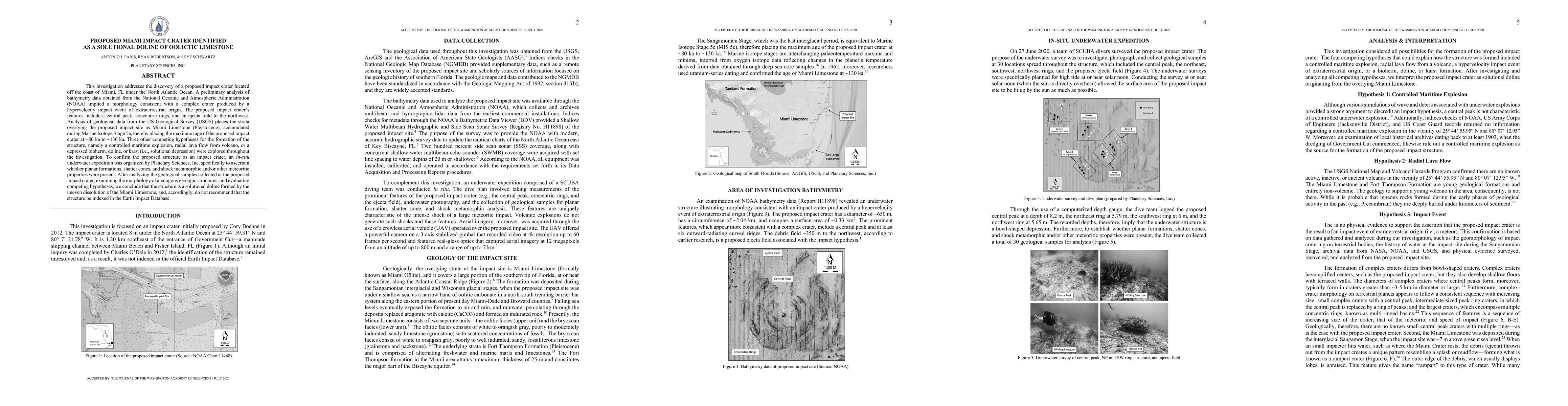 This investigation addresses the discovery of a proposed impact crater located off the coast of Miami, FL under the North Atlantic Ocean. A preliminary analysis of bathymetry data obtained from the National Oceanic and Atmospheric Administration implied a morphology consistent with a complex crater produced by a hypervelocity impact event of extraterrestrial origin. The proposed impact features include a central peak, concentric rings, and an ejecta field to the northwest. Analysis of geological data from the US Geological Survey places the strata overlying the proposed impact site as Miami Limestone, Pleistocene, accumulated during Marine Isotope Stage 5e, thereby placing the maximum age of the proposed impact crater at 80 ka to 130 ka. Three other competing hypotheses for the formation of the structure, namely a controlled maritime explosion, radial lava flow from volcano, or a depressed bioherm, doline, or karst (solutional depression) were explored throughout the investigation. To confirm the proposed structure as an impact crater, an in-situ underwater expedition was organized by Planetary Sciences, Inc. specifically to ascertain whether planar formations, shatter cones, and shock metamorphic and or other meteoritic properties were present. After analyzing the geological samples collected at the proposed impact crater, examining the morphology of analogous geologic structures, and evaluating competing hypotheses, we conclude that the structure is a solutional doline formed by the uneven dissolution of the Miami Limestone, and, accordingly, do not recommend that the structure be indexed in the Earth Impact Database