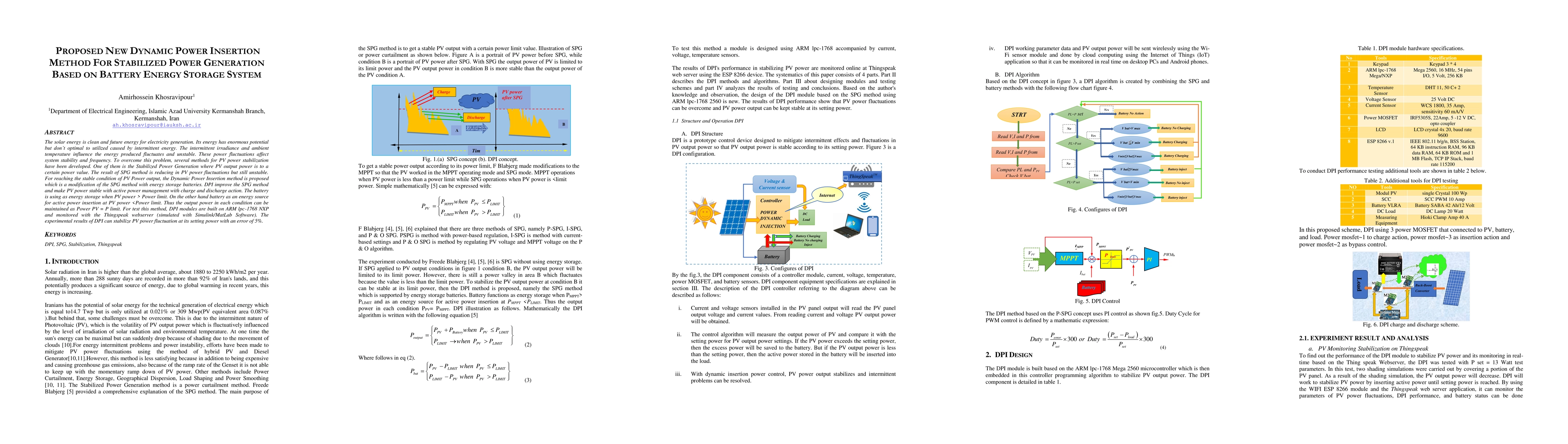 The solar energy is clean and future energy for electricity generation. Its energy has enormous potential but do not optimal to utilized caused by intermittent energy. The intermittent radiance and ambient temperature influence the energy produced fluctuates and unstable. These power fluctuations affect system stability and frequency. To overcome this problem, several methods for PV power stabilization have been developed. One of them is the Stabilized Power Generation where PV output power is to a certain power value. The result of SPG method is reducing in PV power fluctuations but still unstable. For reaching the stable condition of PV Power output, the Dynamic Power Insertion method is proposed which is a modification of the SPG method with energy storage batteries. DPI improve the SPG method and make PV power stable with active power management with charge and discharge action. The battery is using as energy storage when PV power is larger than Power limit. On the other hand battery as an energy source for active power insertion at PV power is smaller than Power limit. Thus the output power in each condition can be maintained as Power PV equals to P limit. For test this method, DPI modules are built on ARM lpc1768 NXP and monitored with the Thing speak webserver (simulated with Simulink MatLab Software). The experimental results of DPI can stabilize PV power fluctuation at its setting power with an error of 5 percent.