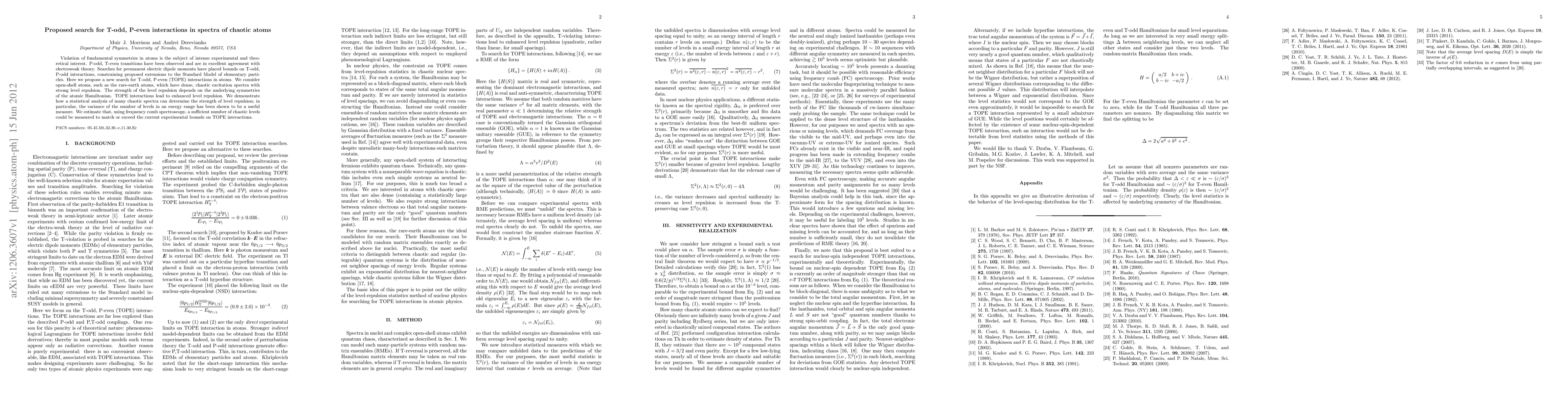 Violation of fundamental symmetries in atoms is the subject of intense experimental and theoretical interest. P-odd, T-even transitions have been observed and are in excellent agreement with electroweak theory. Searches for permanent electric dipole moments have placed bounds on T-odd, P-odd interactions, constraining proposed extensions to the Standard Model of elementary particles. Here we propose a new search for T-odd, P-even (TOPE) interactions in atoms. We consider open-shell atoms, such as the rare-earth atoms, which have dense, chaotic excitation spectra with strong level repulsion. The strength of the level repulsion depends on the underlying symmetries of the atomic Hamiltonian. TOPE interactions lead to enhanced level repulsion. We demonstrate how a statistical analysis of many chaotic spectra can determine the strength of level repulsion; in particular, the variance of the number of levels in an energy range has been shown to be a useful measure. We estimate that, using frequency comb spectroscopy, a sufficient number of chaotic levels could be measured to match or exceed the current experimental bounds on TOPE interactions.
