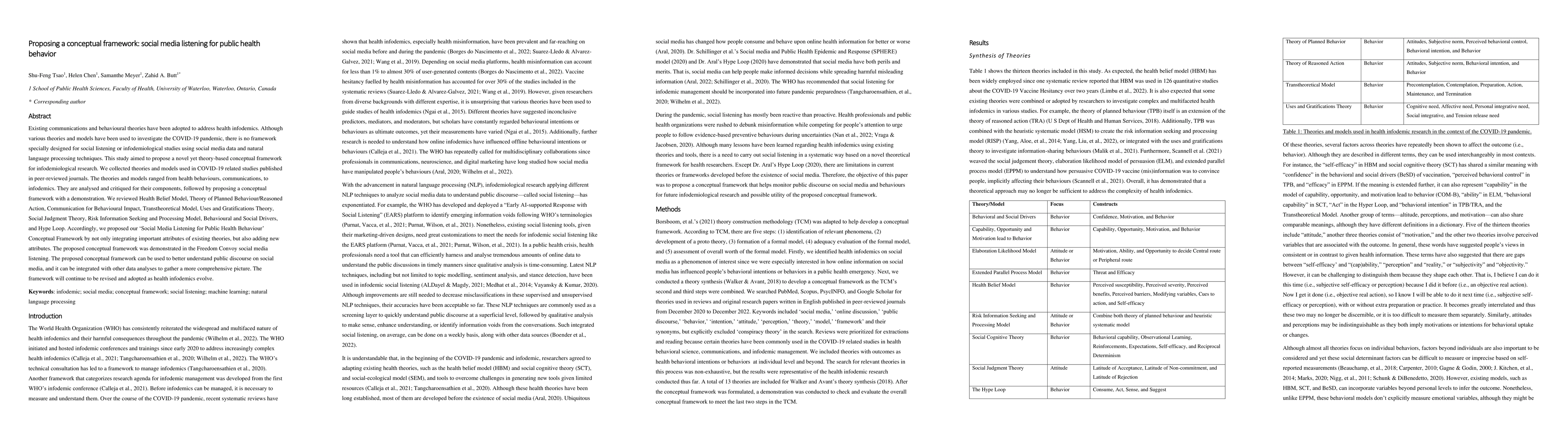 Existing communications and behavioral theories have been adopted to address health misinformation. Although various theories and models have been used to investigate the COVID-19 pandemic, there is no framework specially designed for social listening or misinformation studies using social media data and natural language processing techniques. This study aimed to propose a novel yet theory-based conceptual framework for misinformation research. We collected theories and models used in COVID-19 related studies published in peer-reviewed journals. The theories and models ranged from health behaviors, communications, to misinformation. They are analyzed and critiqued for their components, followed by proposing a conceptual framework with a demonstration. We reviewed Health Belief Model, Theory of Planned Behavior/Reasoned Action, Communication for Behavioral Impact, Transtheoretical Model, Uses and Gratifications Theory, Social Judgment Theory, Risk Information Seeking and Processing Model, Behavioral and Social Drivers, and Hype Loop. Accordingly, we proposed the Social Media Listening for Public Health Behavior Conceptual Framework by not only integrating important attributes of existing theories, but also adding new attributes. The proposed conceptual framework was demonstrated in the Freedom Convoy social media listening. The proposed conceptual framework can be used to better understand public discourse on social media, and it can be integrated with other data analyses to gather a more comprehensive picture. The framework will continue to be revised and adopted as health misinformation evolves.