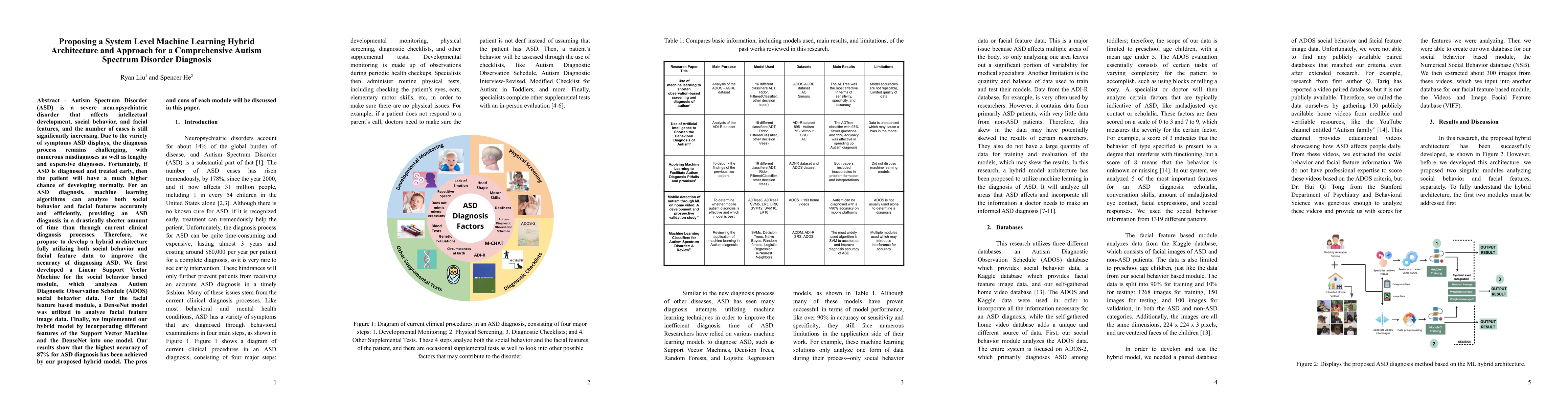 This paper proposes a hybrid machine learning architecture combining social behavior and facial feature data to improve Autism Spectrum Disorder (ASD) diagnosis accuracy. The system uses a Linear Support Vector Machine for social behavior analysis and a DenseNet model for facial feature analysis, achieving an 87% accuracy rate, significantly enhancing the efficiency and precision of ASD diagnosis.