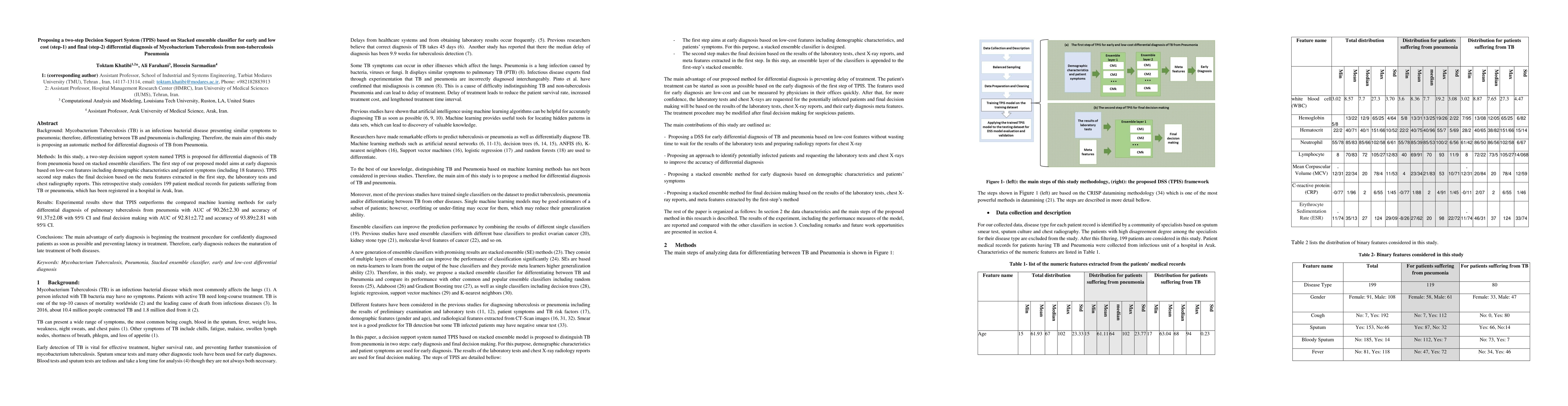 Background: Mycobacterium Tuberculosis (TB) is an infectious bacterial disease presenting similar symptoms to pneumonia; therefore, differentiating between TB and pneumonia is challenging. Therefore, the main aim of this study is proposing an automatic method for differential diagnosis of TB from Pneumonia. Methods: In this study, a two-step decision support system named TPIS is proposed for differential diagnosis of TB from pneumonia based on stacked ensemble classifiers. The first step of our proposed model aims at early diagnosis based on low-cost features including demographic characteristics and patient symptoms (including 18 features). TPIS second step makes the final decision based on the meta features extracted in the first step, the laboratory tests and chest radiography reports. This retrospective study considers 199 patient medical records for patients suffering from TB or pneumonia, which has been registered in a hospital in Arak, Iran. Results: Experimental results show that TPIS outperforms the compared machine learning methods for early differential diagnosis of pulmonary tuberculosis from pneumonia with AUC of 90.26 and accuracy of 91.37 and final decision making with AUC of 92.81 and accuracy of 93.89. Conclusions: The main advantage of early diagnosis is beginning the treatment procedure for confidently diagnosed patients as soon as possible and preventing latency in treatment. Therefore, early diagnosis reduces the maturation of late treatment of both diseases.