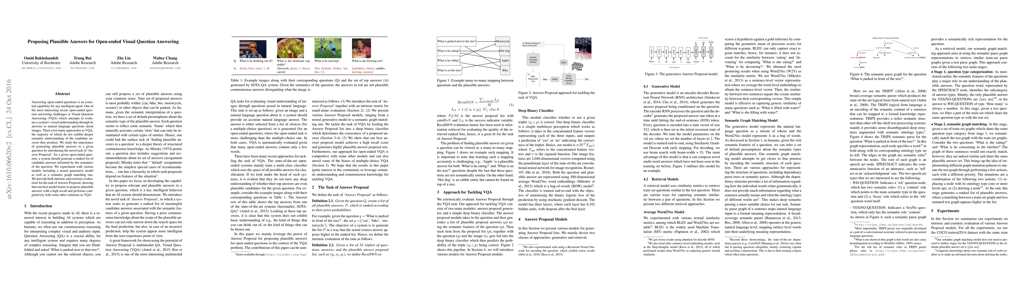 Answering open-ended questions is an essential capability for any intelligent agent. One of the most interesting recent open-ended question answering challenges is Visual Question Answering (VQA) which attempts to evaluate a system's visual understanding through its answers to natural language questions about images. There exist many approaches to VQA, the majority of which do not exhibit deeper semantic understanding of the candidate answers they produce. We study the importance of generating plausible answers to a given question by introducing the novel task of `Answer Proposal': for a given open-ended question, a system should generate a ranked list of candidate answers informed by the semantics of the question. We experiment with various models including a neural generative model as well as a semantic graph matching one. We provide both intrinsic and extrinsic evaluations for the task of Answer Proposal, showing that our best model learns to propose plausible answers with a high recall and performs competitively with some other solutions to VQA.