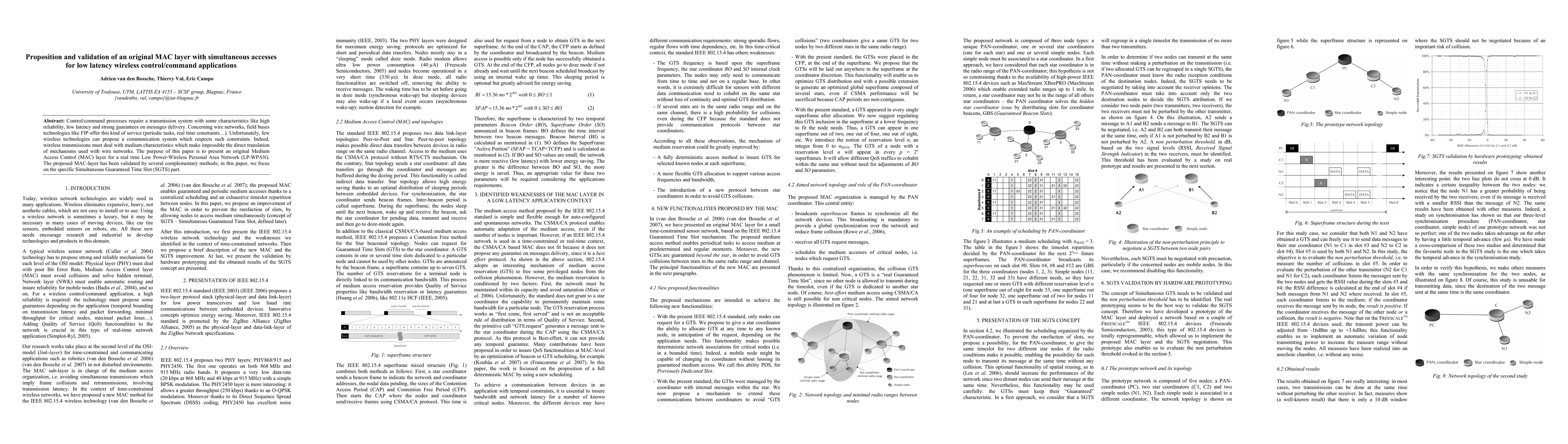 Control/command processes require a transmission system with some characteristics like high reliability, low latency and strong guarantees on messages delivery. Concerning wire networks, field buses technologies like FIP offer this kind of service (periodic tasks, real time constraints...). Unfortunately, few wireless technologies can propose a communication system which respects such constraints. Indeed, wireless transmissions must deal with medium characteristics which make impossible the direct translation of mechanisms used with wire networks. The purpose of this paper is to present an original Medium Access Control (MAC) layer for a real time Low Power-Wireless Personal Area Network (LP-WPAN). The proposed MAC-layer has been validated by several complementary methods; in this paper, we focus on the specific Simultaneous Guaranteed Time Slot (SGTS) part.