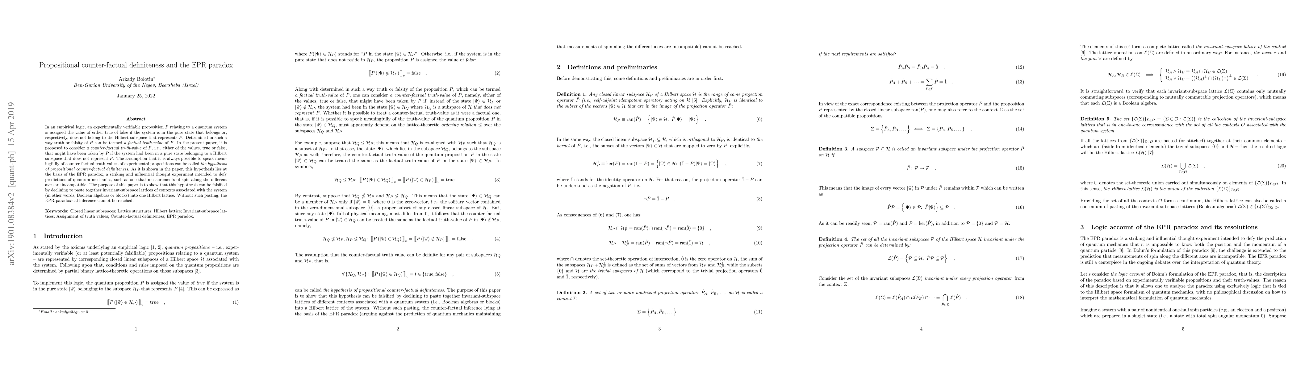 In an empirical logic, an experimentally verifiable proposition P relating to a quantum system is assigned the value of either true of false if the system is in the pure state that belongs or, respectively, does not belong to the Hilbert subspace that represents P. Determined in such a way truth or falsity of P can be termed a factual truth-value of P. In the present paper, it is proposed to consider a counter-factual truth-value of P, i.e., either of the values, true or false, that would have been taken by P if the system had been in a pure state belonging to a Hilbert subspace that does not represent P. The assumption that it is always possible to speak meaningfully of counter-factual truth-values of experimental propositions can be called the hypothesis of propositional counter-factual definiteness. As it is shown in the paper, this hypothesis lies at the basis of the EPR paradox, a striking and influential thought experiment intended to defy predictions of quantum mechanics, such as one that measurements of spin along the different axes are incompatible. The purpose of this paper is to show that this hypothesis can be falsified by declining to paste together invariant-subspace lattices of contexts associated with the system (in other words, Boolean algebras or blocks) into one Hilbert lattice. Without such pasting, the EPR paradoxical inference cannot be reached.
