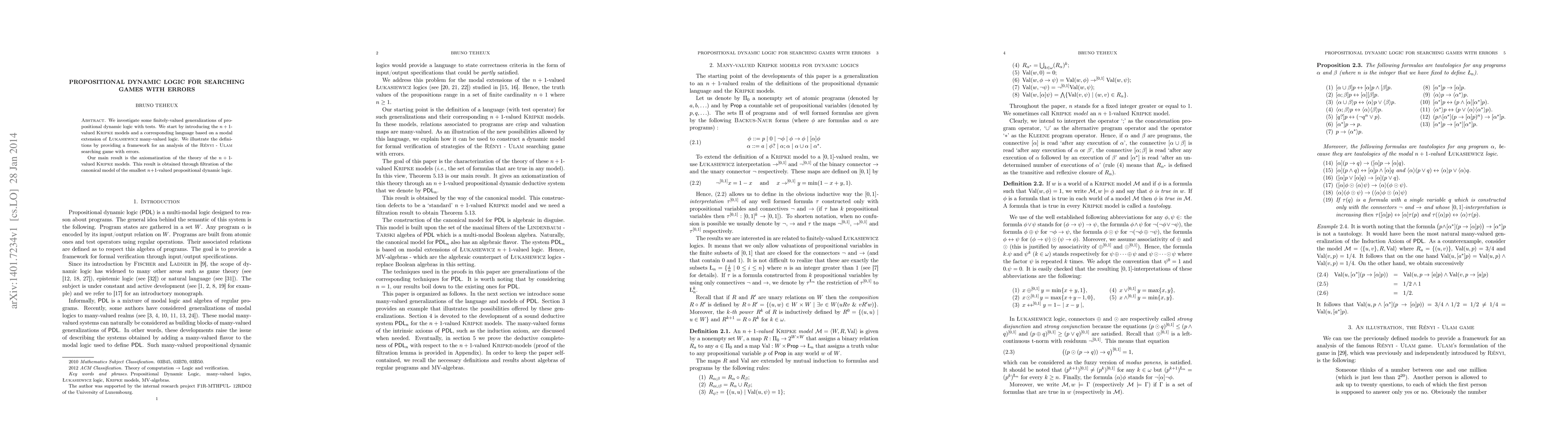 This paper proposes an (n+1)-valued generalization of propositional dynamic logic to analyze searching games with errors, introducing (n+1)-valued Kripke models and a corresponding modal logic based on Lukasiewicz many-valued logic. The main result is the axiomatization of the theory for these models, achieved via filtration of the canonical model of the smallest (n+1)-valued propositional dynamic logic.