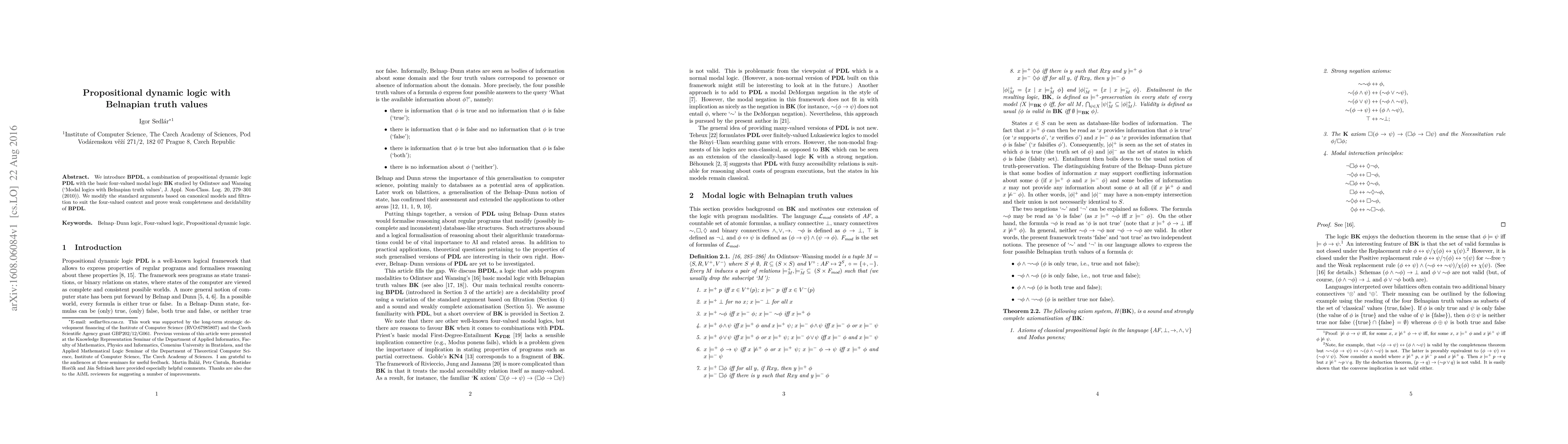 The paper introduces BPDL, adapts standard techniques for PDL to the four-valued Belnapian setting, and provides a sound and weakly complete axiomatization for BPDL, along with a decidability proof.
