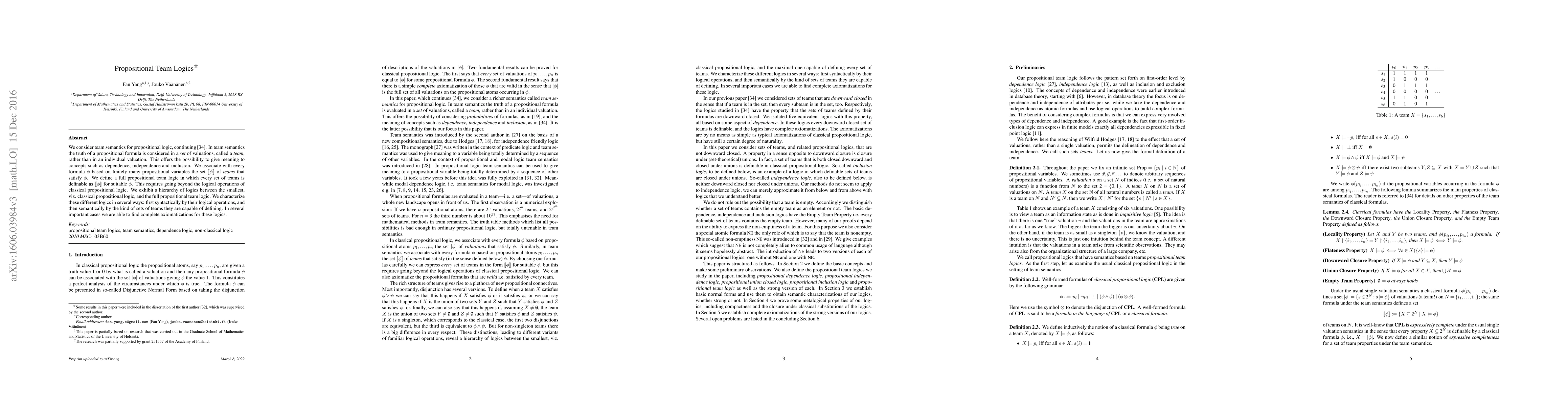 The paper develops team semantics for propositional logic, offering a framework to interpret logical formulas in sets of valuations (teams) to account for concepts like dependence and independence. It defines a maximal logic, full propositional team logic, extending beyond classical logic, and presents a hierarchy of logics, characterized syntactically and semantically, with complete axiomatizations for several cases.