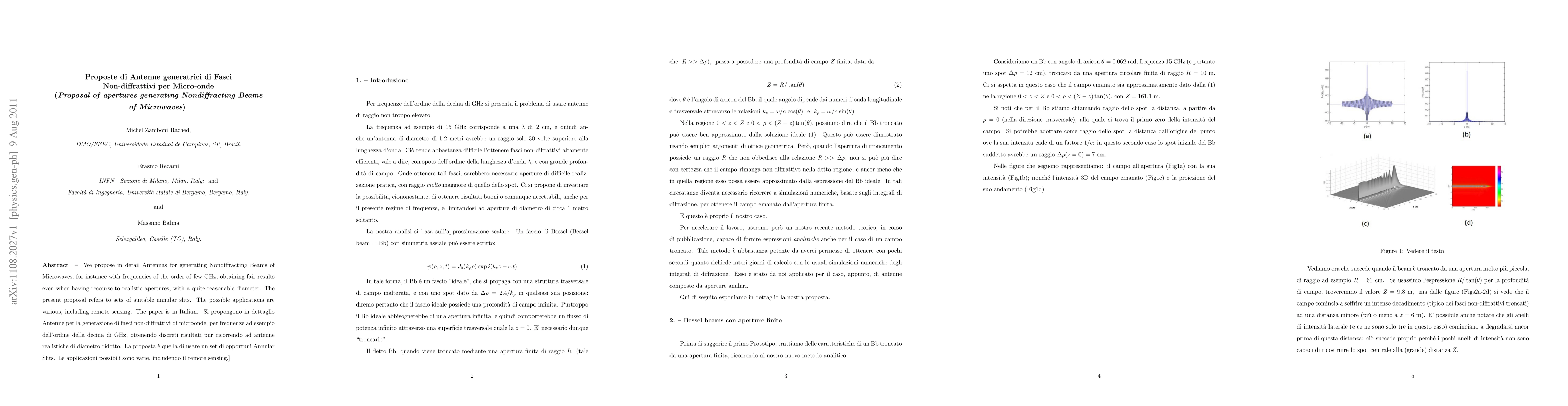 We propose in detail Antennas for generating Nondiffracting Beams of Microwaves, for instance with frequencies of the order of few GHz, obtaining fair results even when having recourse to realistic apertures, with a quite reasonable diameter. The present proposal refers to sets of suitable annular slits. The possible applications are various, including remote sensing. The paper is in Italian. [Si propongono in dettaglio Antenne per la generazione di fasci non-diffrattivi di microonde, per frequenze ad esempio dell'ordine della decina di GHz, ottenendo discreti risultati pur ricorrendo ad antenne realistiche di diametro ridotto. La proposta e' quella di usare un set di opportuni Annular Slits. Le applicazioni possibili sono varie, includendo il remore sensing.]