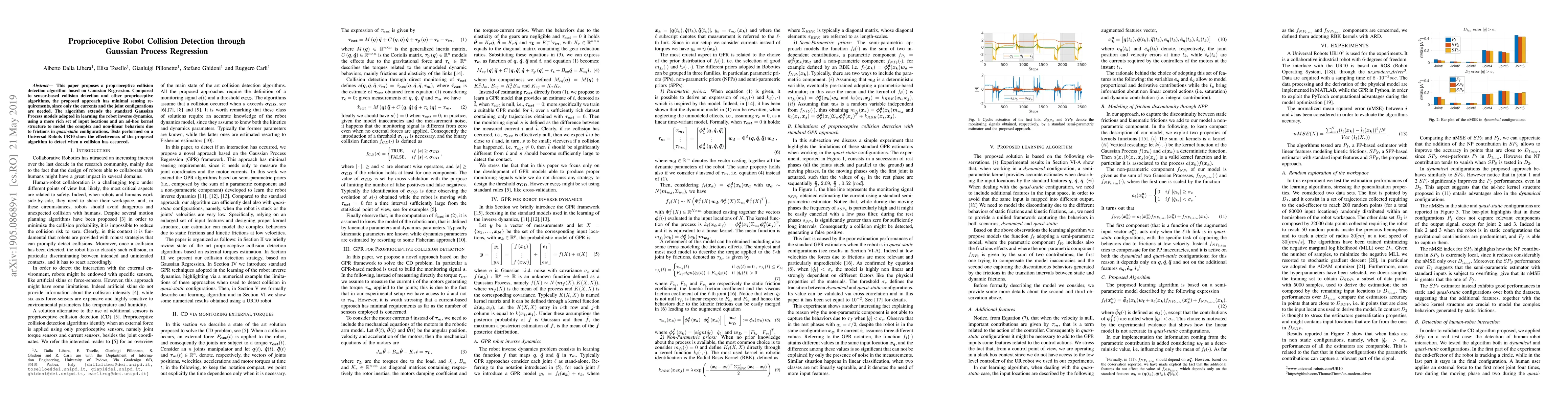 This paper proposes a proprioceptive collision detection algorithm based on Gaussian Regression. Compared to sensor-based collision detection and other proprioceptive algorithms, the proposed approach has minimal sensing requirements, since only the currents and the joint configurations are needed. The algorithm extends the standard Gaussian Process models adopted in learning the robot inverse dynamics, using a more rich set of input locations and an ad-hoc kernel structure to model the complex and non-linear behaviors due to frictions in quasi-static configurations. Tests performed on a Universal Robots UR10 show the effectiveness of the proposed algorithm to detect when a collision has occurred.