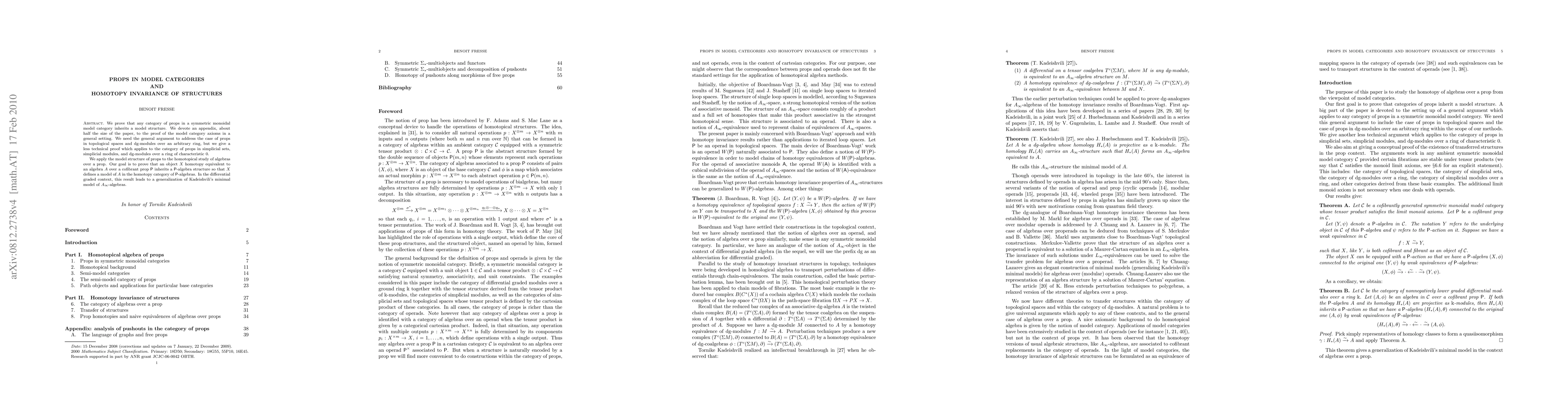 This paper establishes a model structure for categories of props within symmetric monoidal model categories, particularly focusing on topological spaces and dg-modules. It then uses this model structure to demonstrate that homotopy equivalent objects inherit a P-algebra structure, thereby generalizing Kadeishvili's minimal model for A-infinity algebras in the differential graded context.