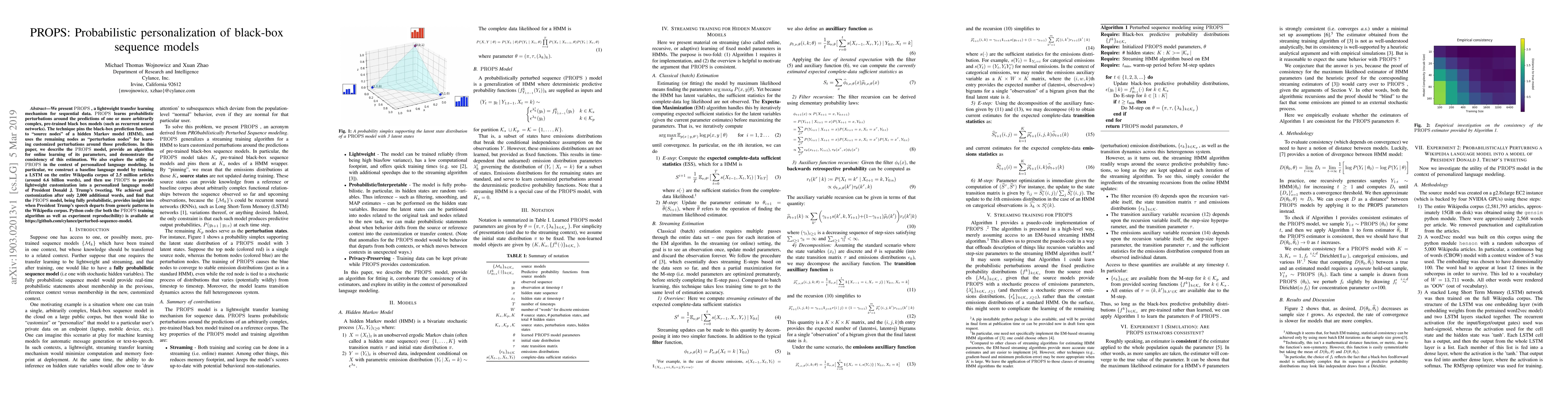 PROPS is a lightweight transfer learning method for customizing black-box sequence models using probabilistic perturbations. It leverages a hidden Markov model to refine pre-trained models like LSTMs, achieving effective personalization with minimal additional data, as demonstrated in a case study on President Trump's tweets.